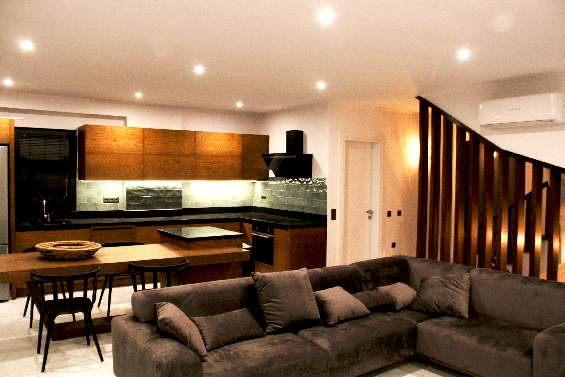 Take a flight of stairs to the middle floor of the house and you will find the modern open plan kitchen and living room with balcony looking out to sea. Large sliding doors open up to make the balcony and living area one beautiful space.
