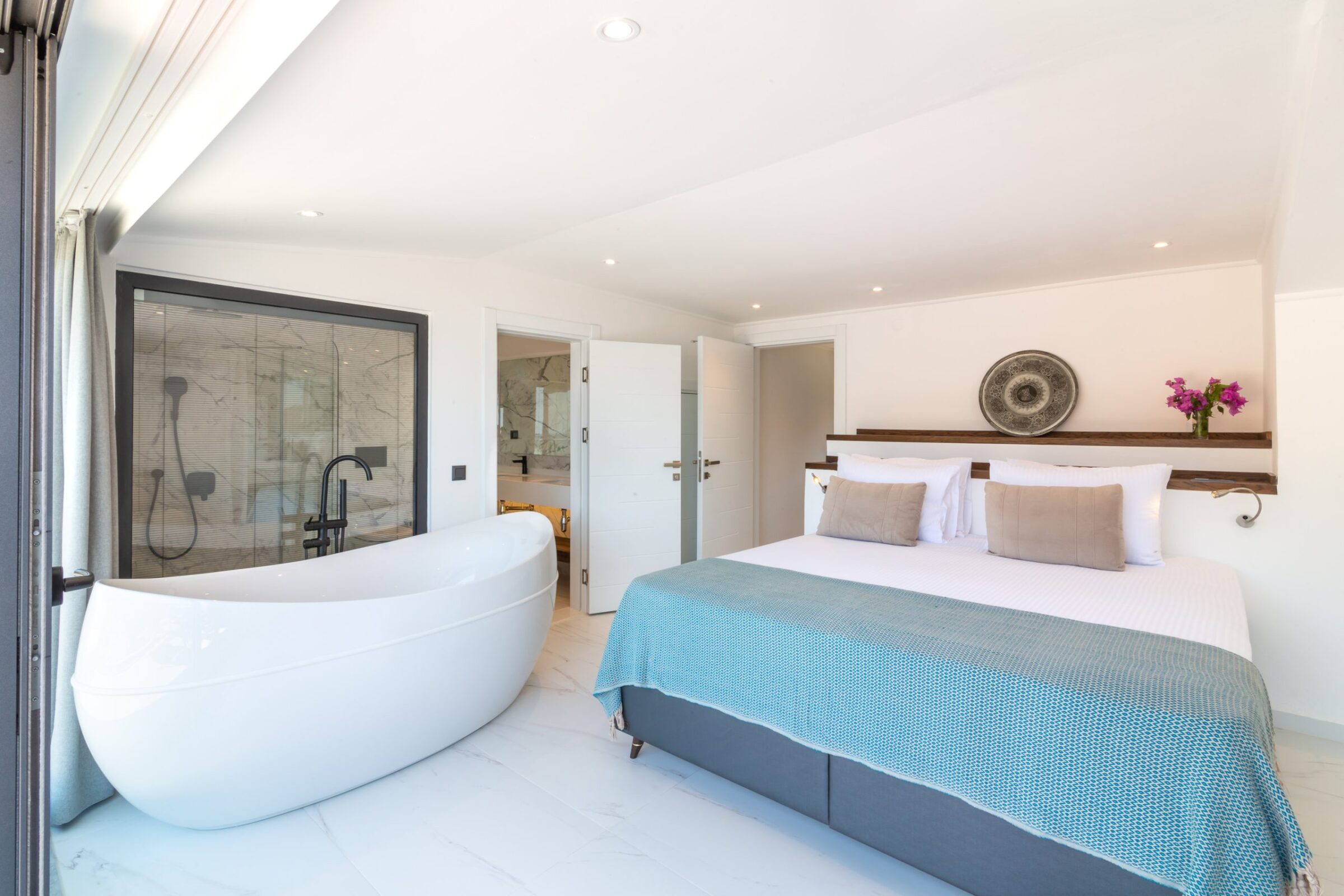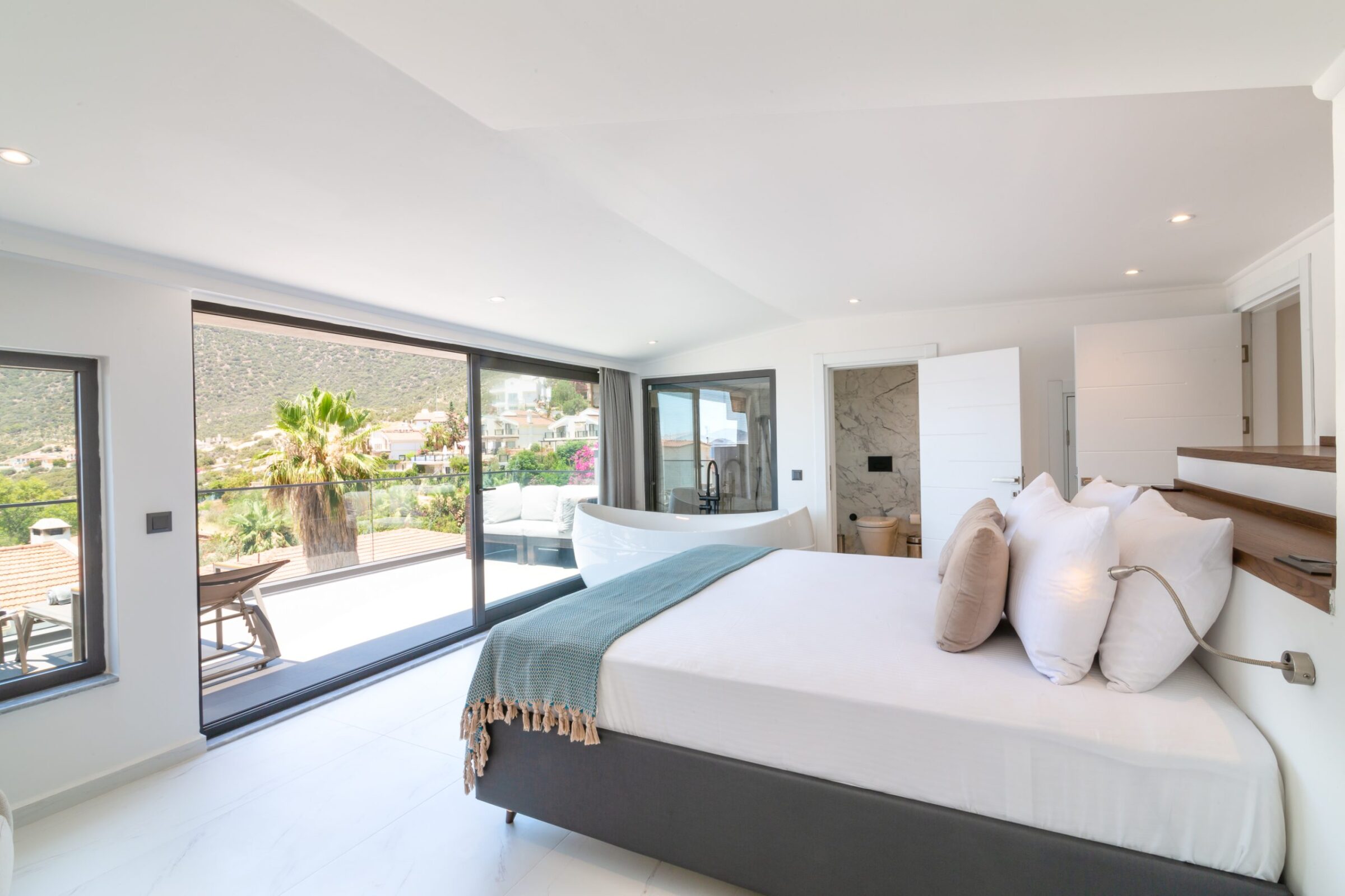 Master bedroom suite with private terrace and stunning views of Kalamar Bay. From the bedroom you can soak in a relaxing bath while enjoying the view!