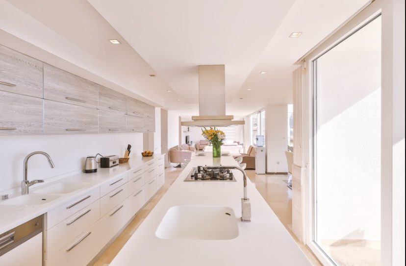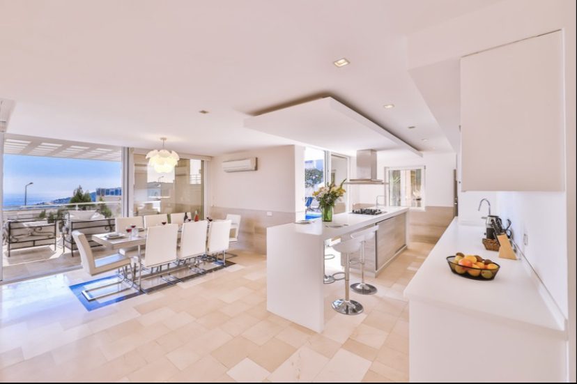 - Spacious open-plan living area with modern kitchen and sea views