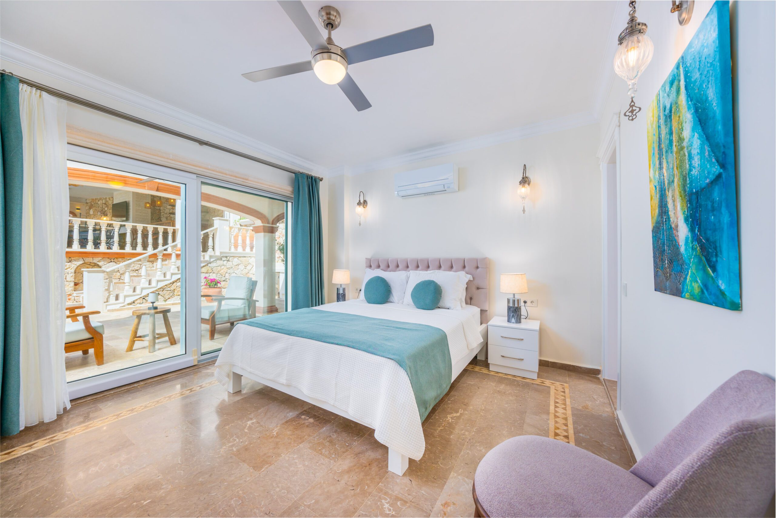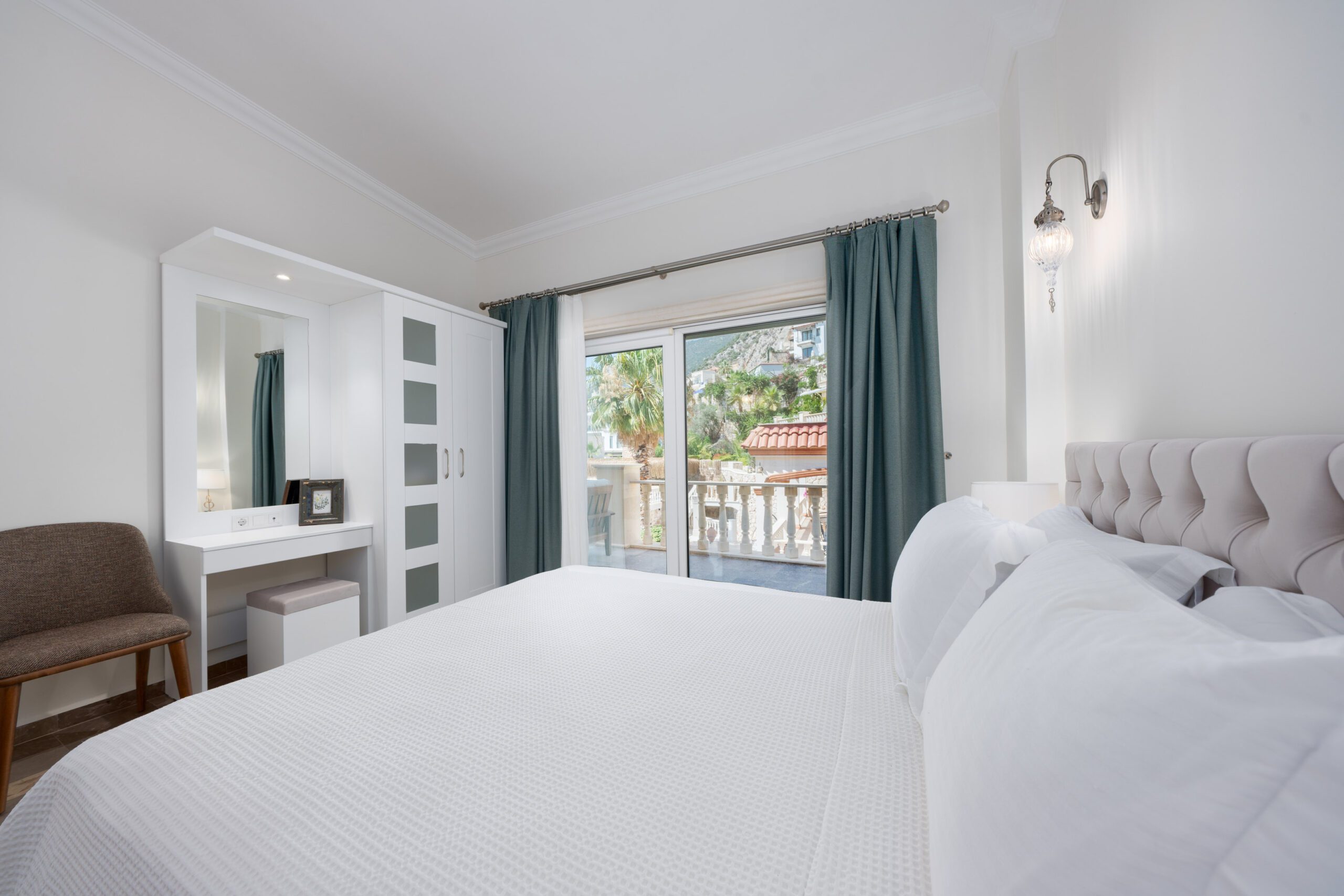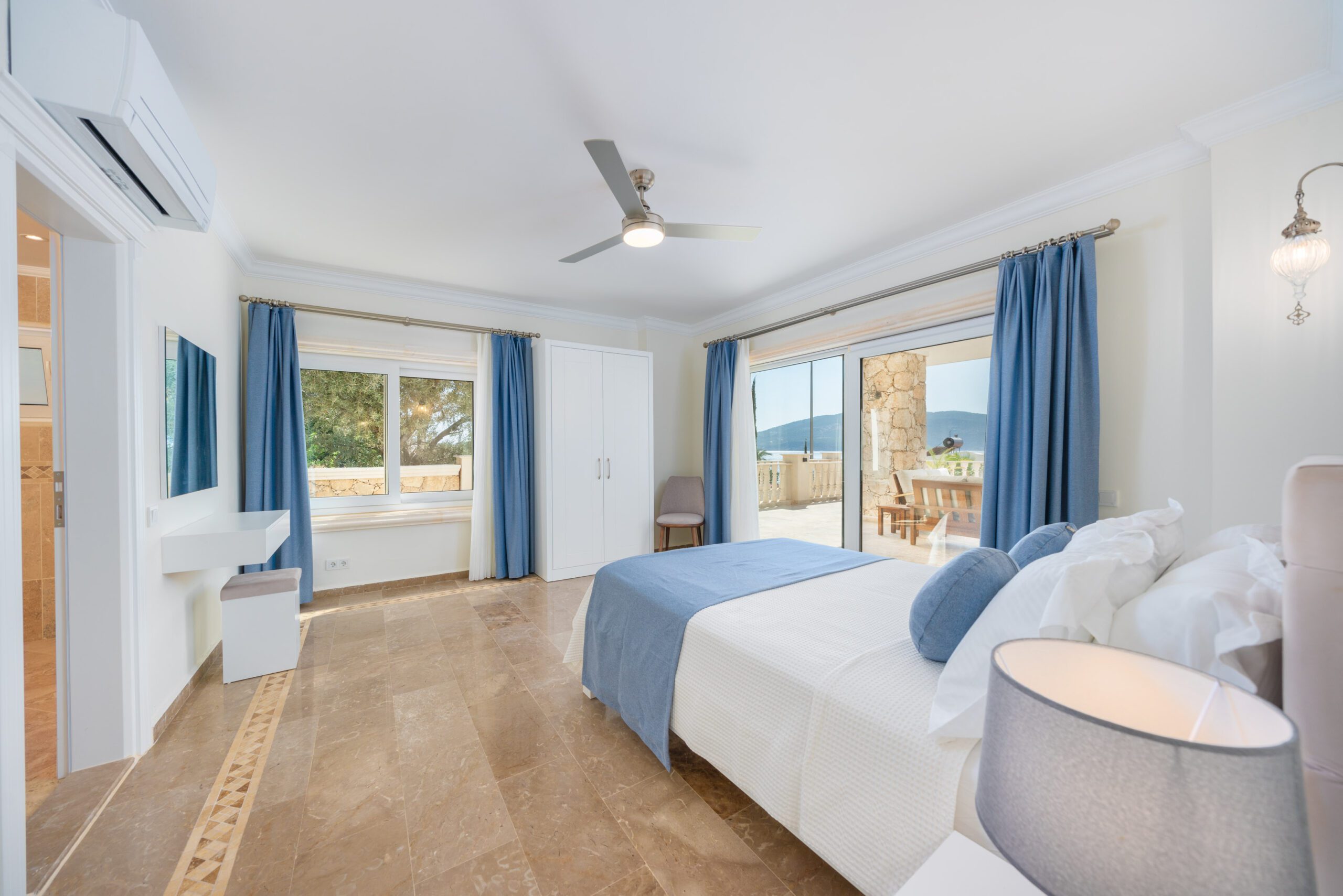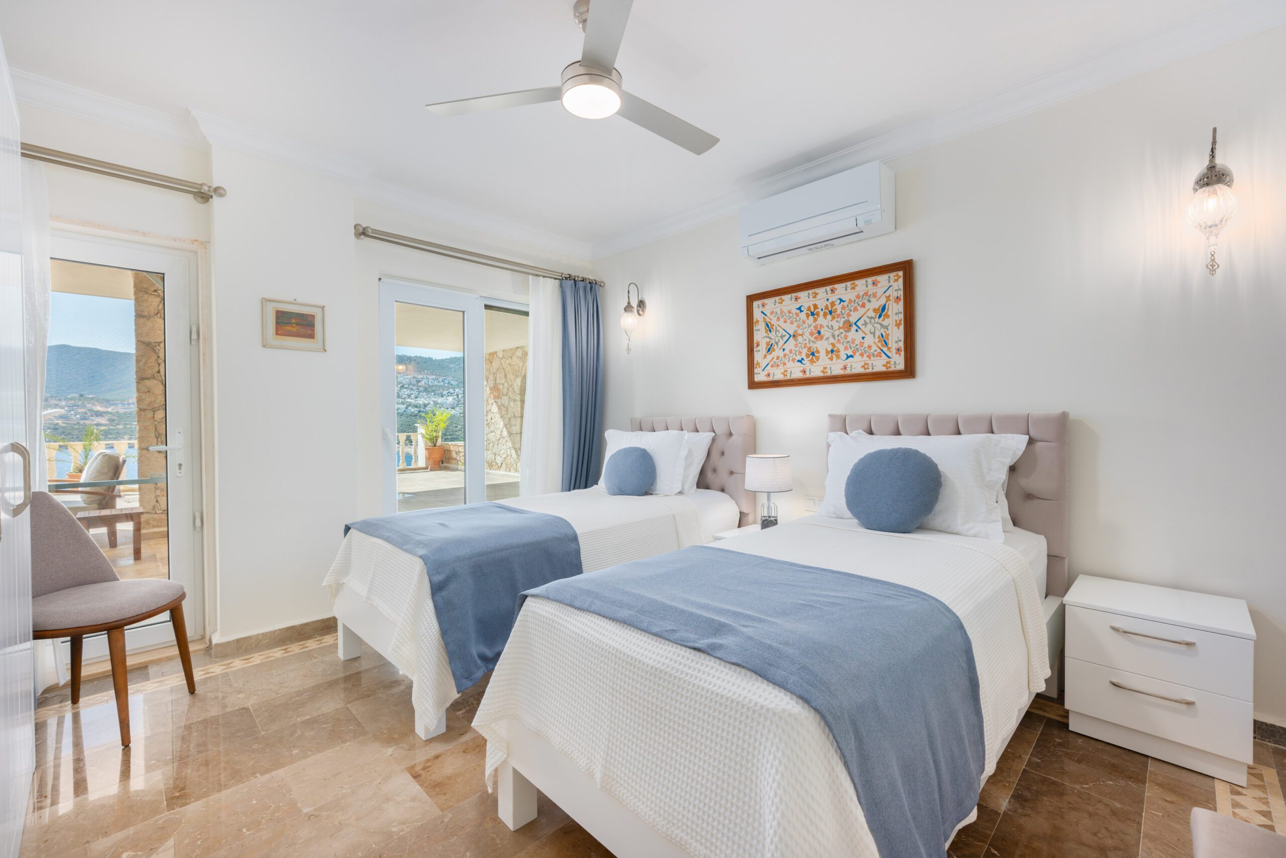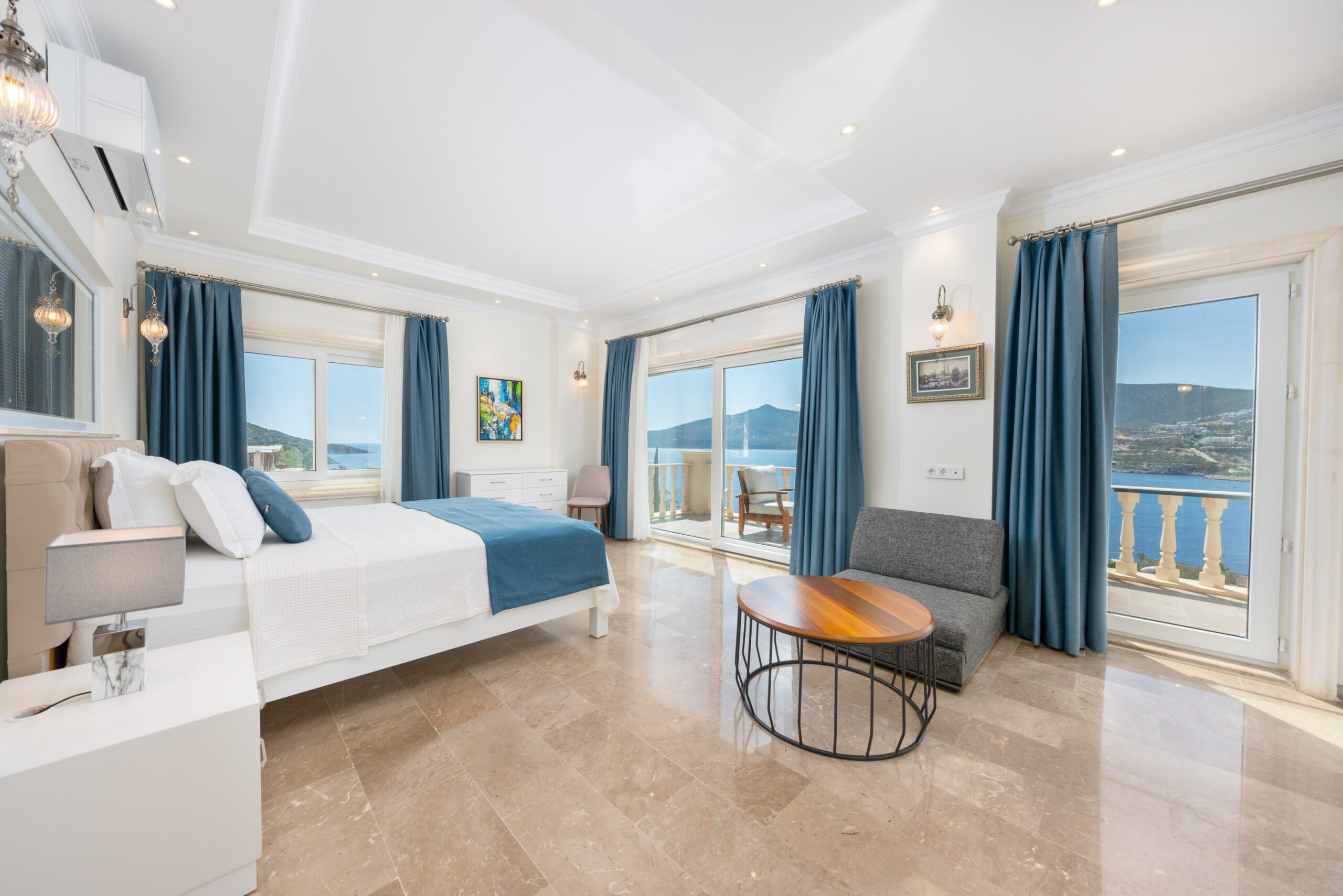 Two modern double bedrooms both with ensuite bathrooms and a shared balcony overlooking Kalkan’s bay, and the master bedroom with an ensuite and private balcony, ensuring comfort and privacy.