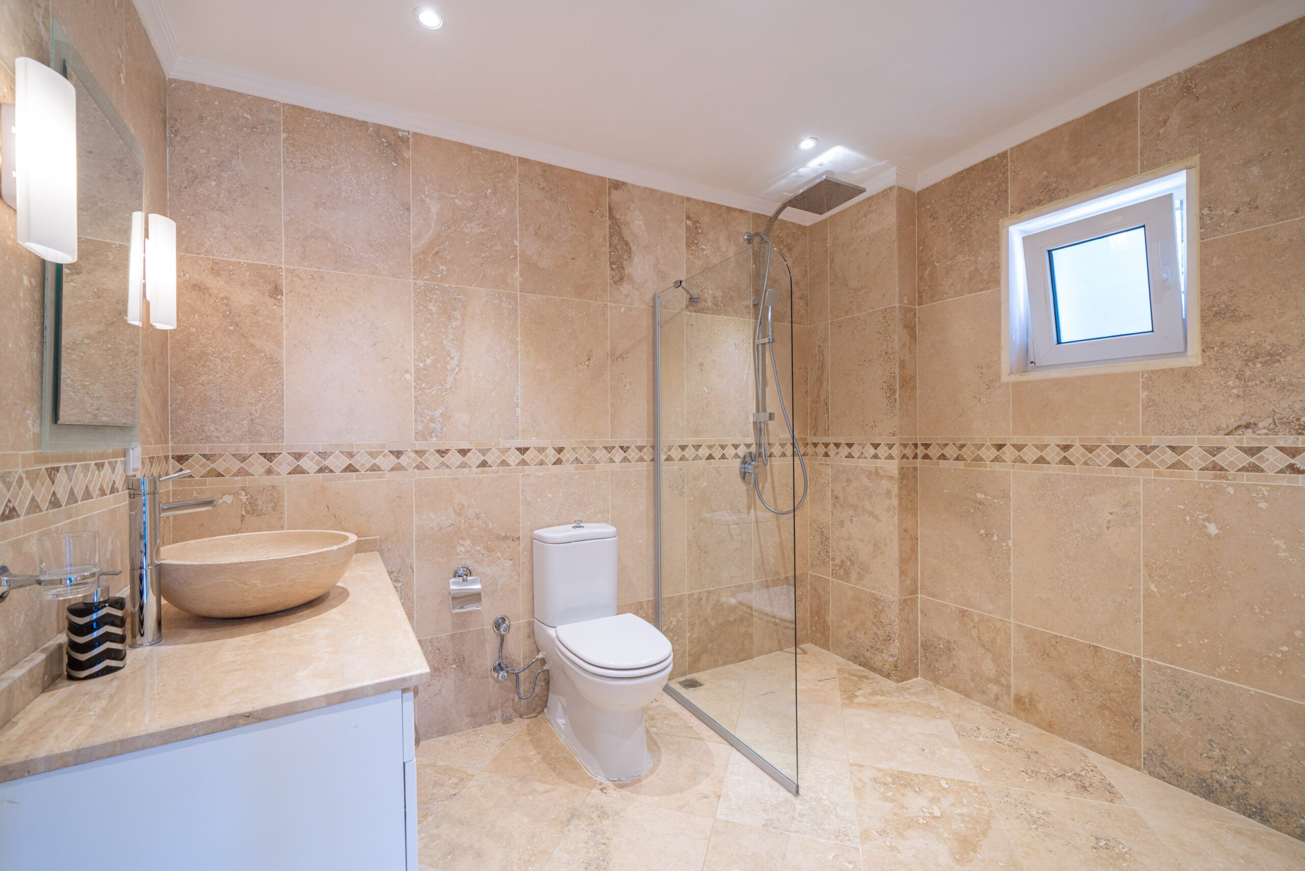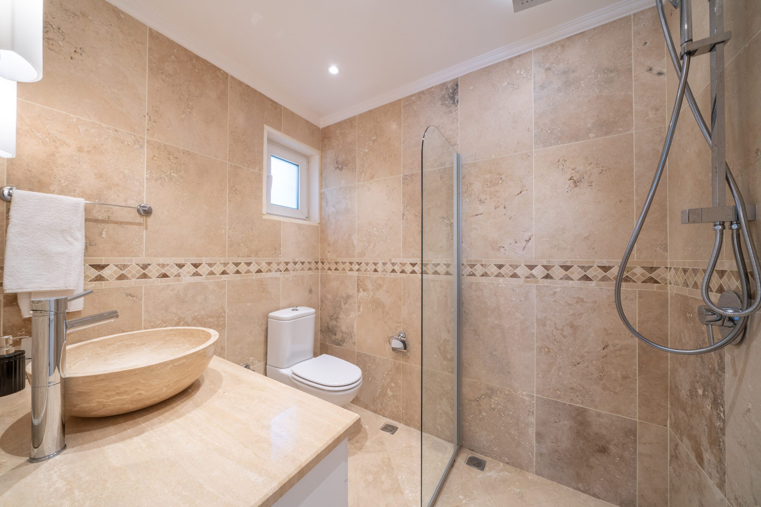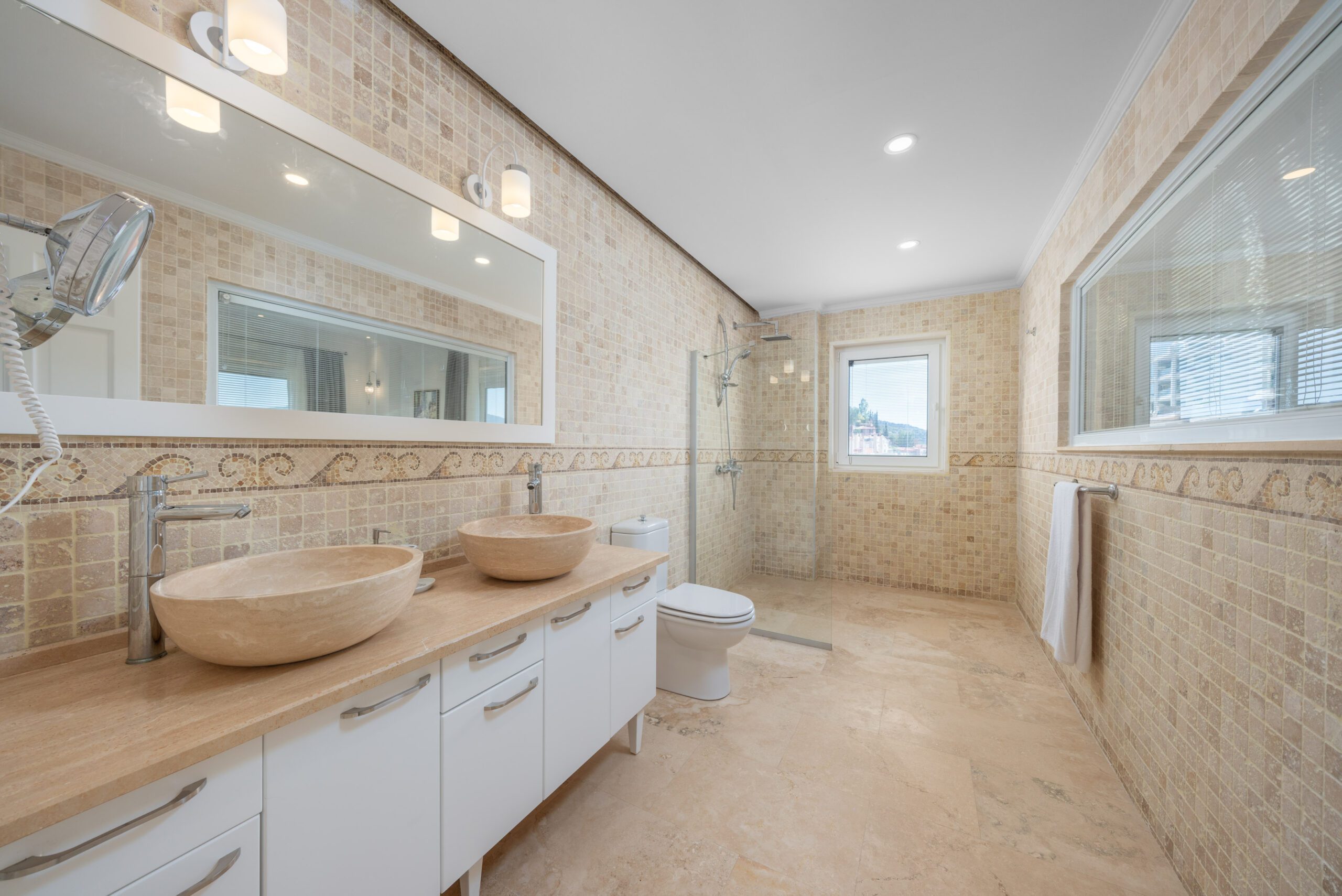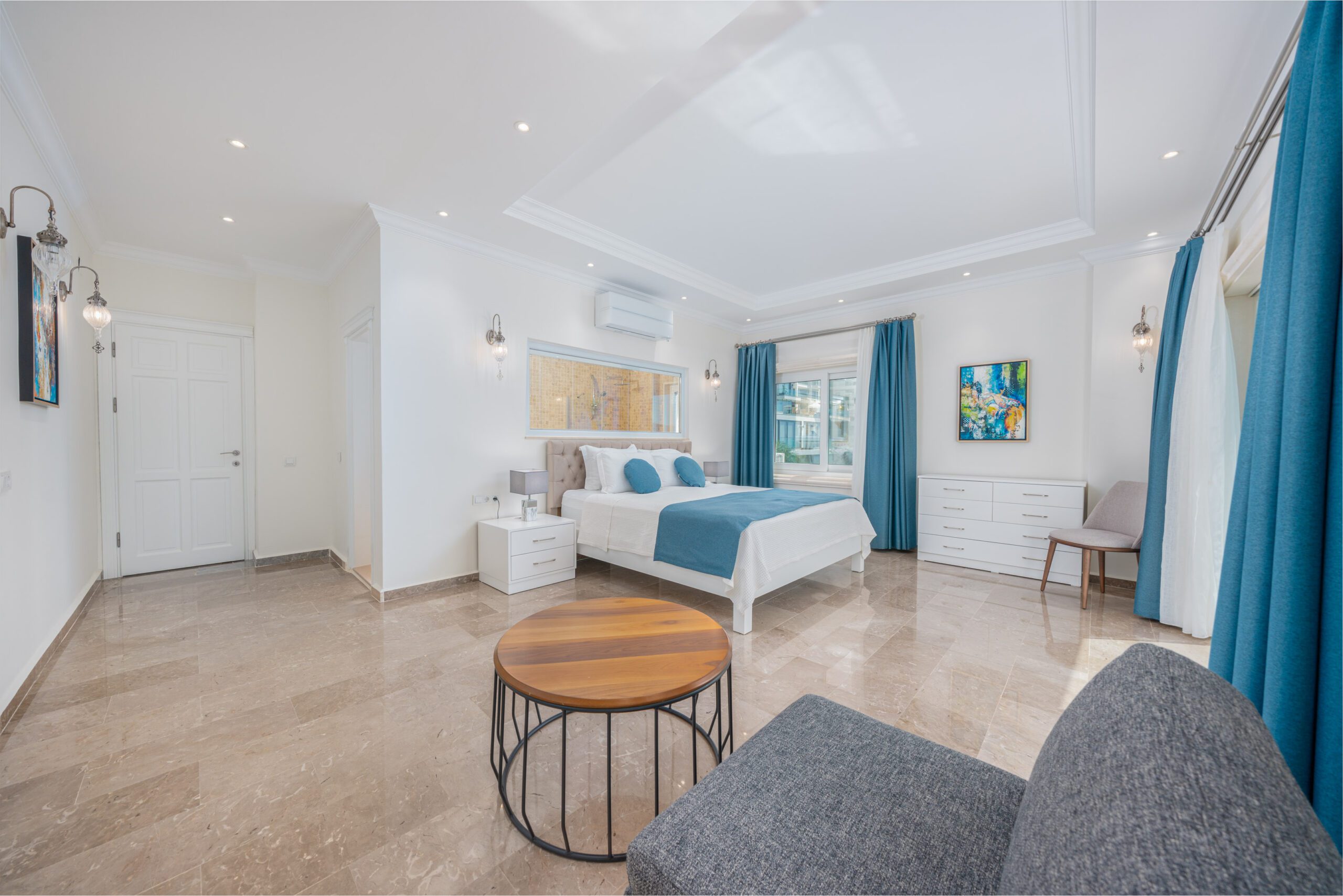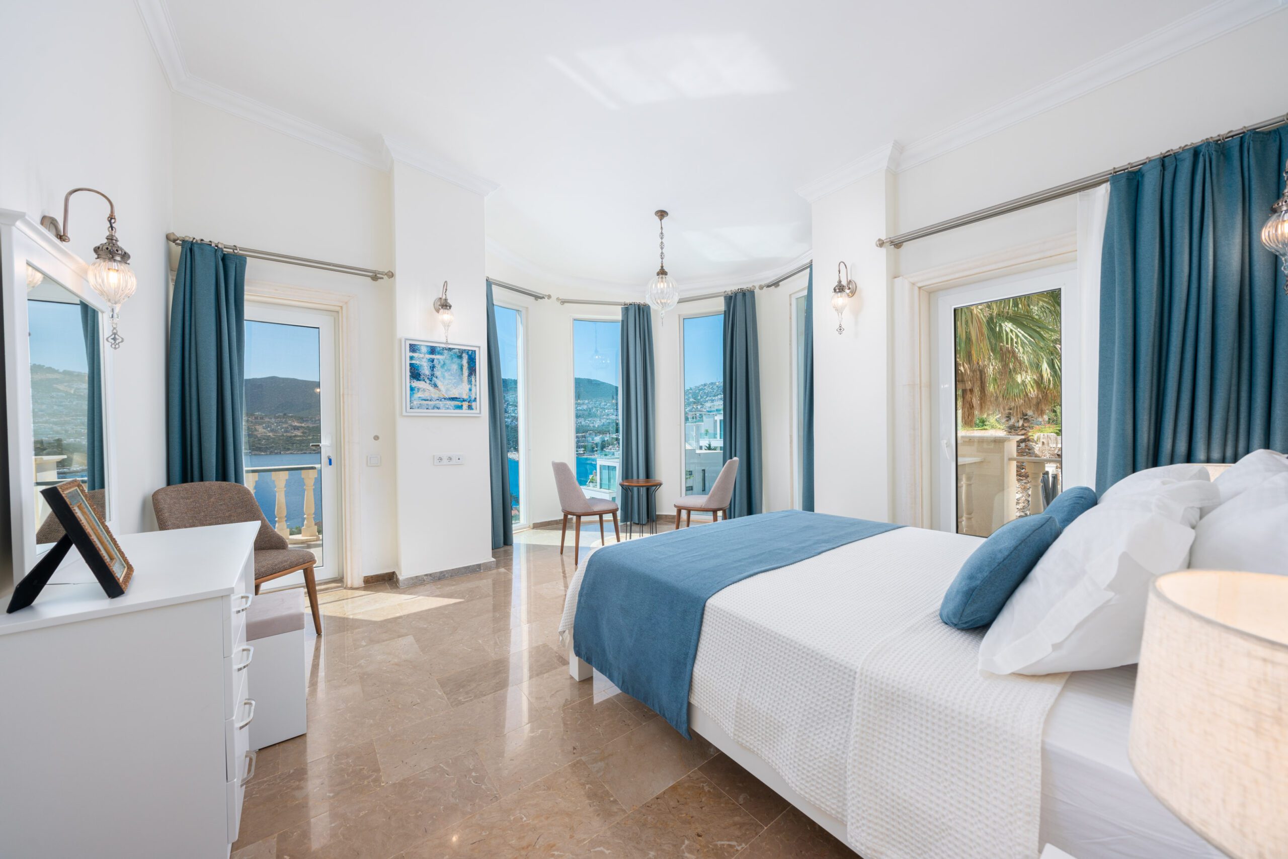 Two modern double bedrooms both with ensuite bathrooms and a shared balcony overlooking Kalkan’s bay, and the master bedroom with an ensuite and private balcony, ensuring comfort and privacy.