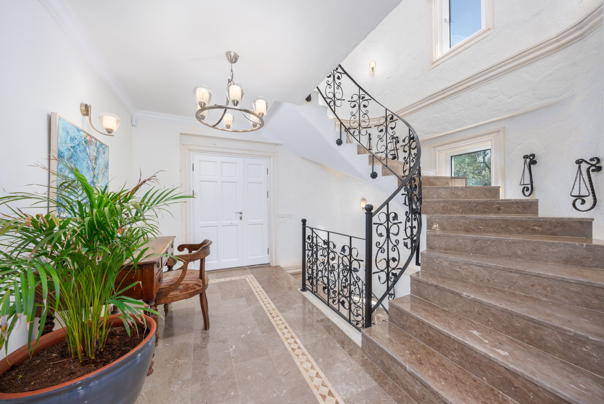 Two spacious bedrooms are located on the lower ground floor, each with ensuite facilities and sea-view terraces. The lower level also boasts a fully equipped gym, spa facilities including a sauna and Turkish Hammam, and a kitchenette for added convenience.