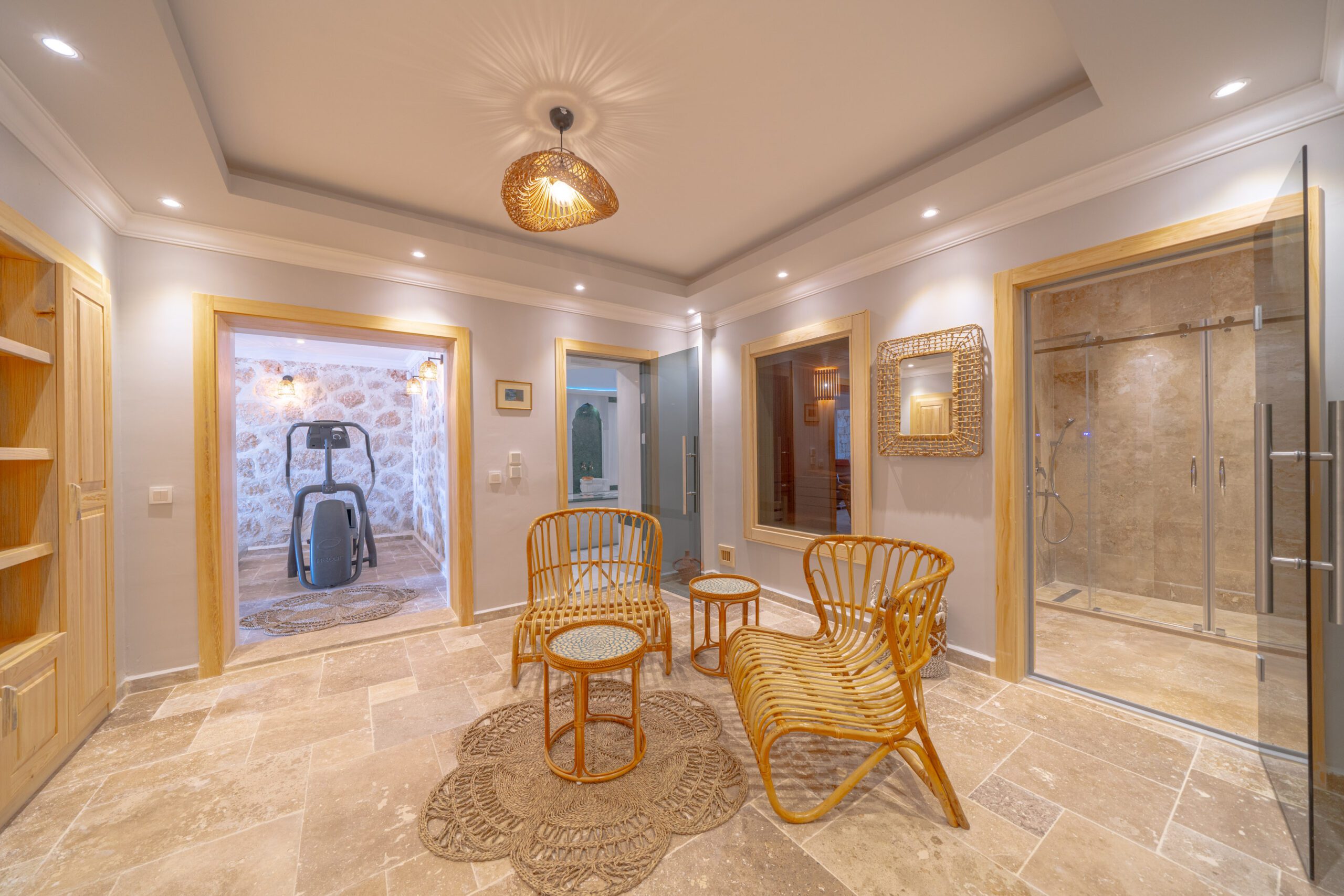 The lower ground floor of Villa Aqua Verde includes a gym with a treadmill, exercise bike, and step machine, along with spa facilities such as a vibrating lounger, massage bed, sauna, Turkish Hammam, and bucket hydrotherapy shower. A kitchenette and utility room are also located on this level, with external steps connecting to the pool terrace and street level.