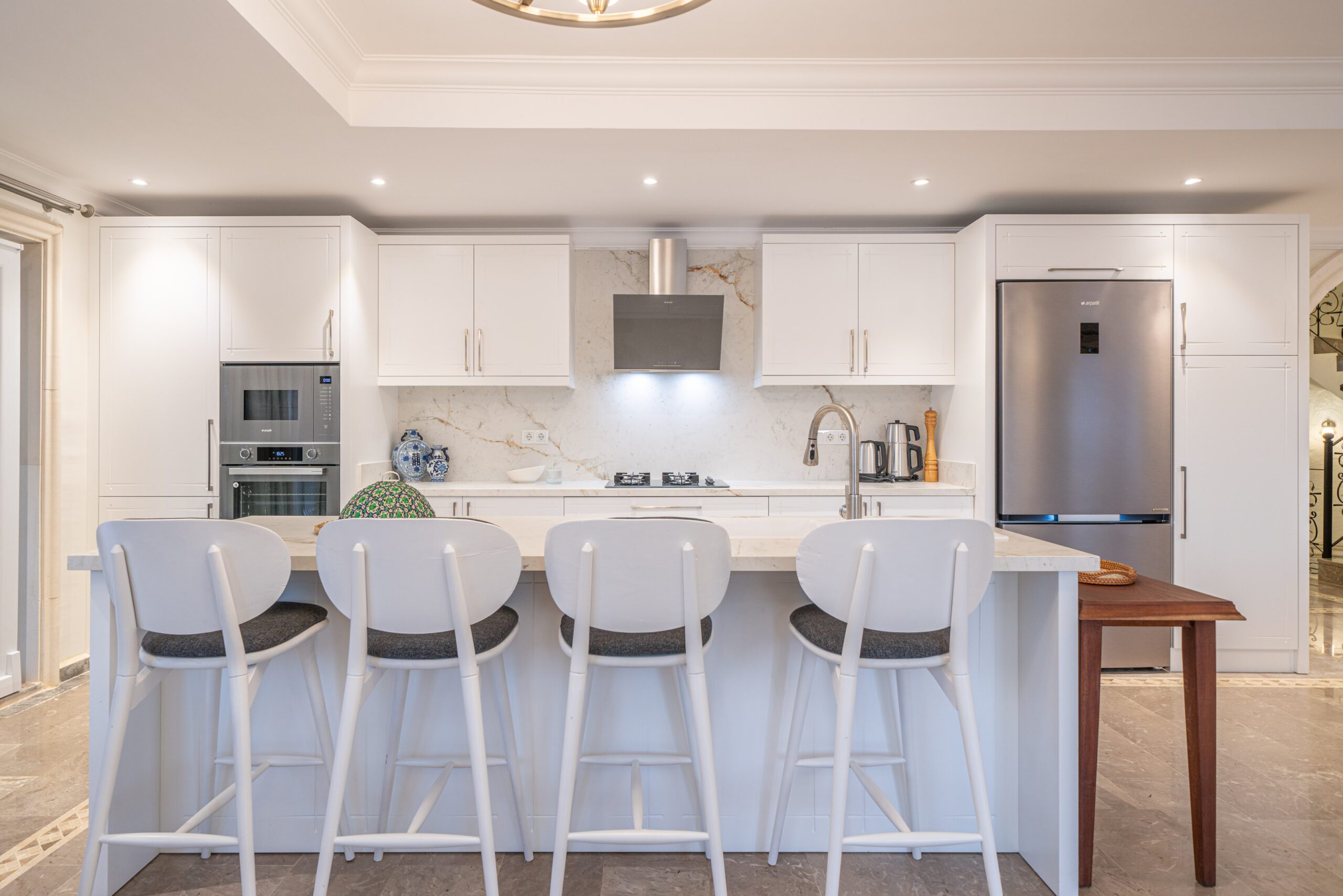 The sleek, fully equipped kitchen features a central island with bar stool seating—ideal for casual breakfasts or evening drinks. For more formal meals, a stylish circular dining table seats up to eight guests, creating a sociable setting for shared dinners.