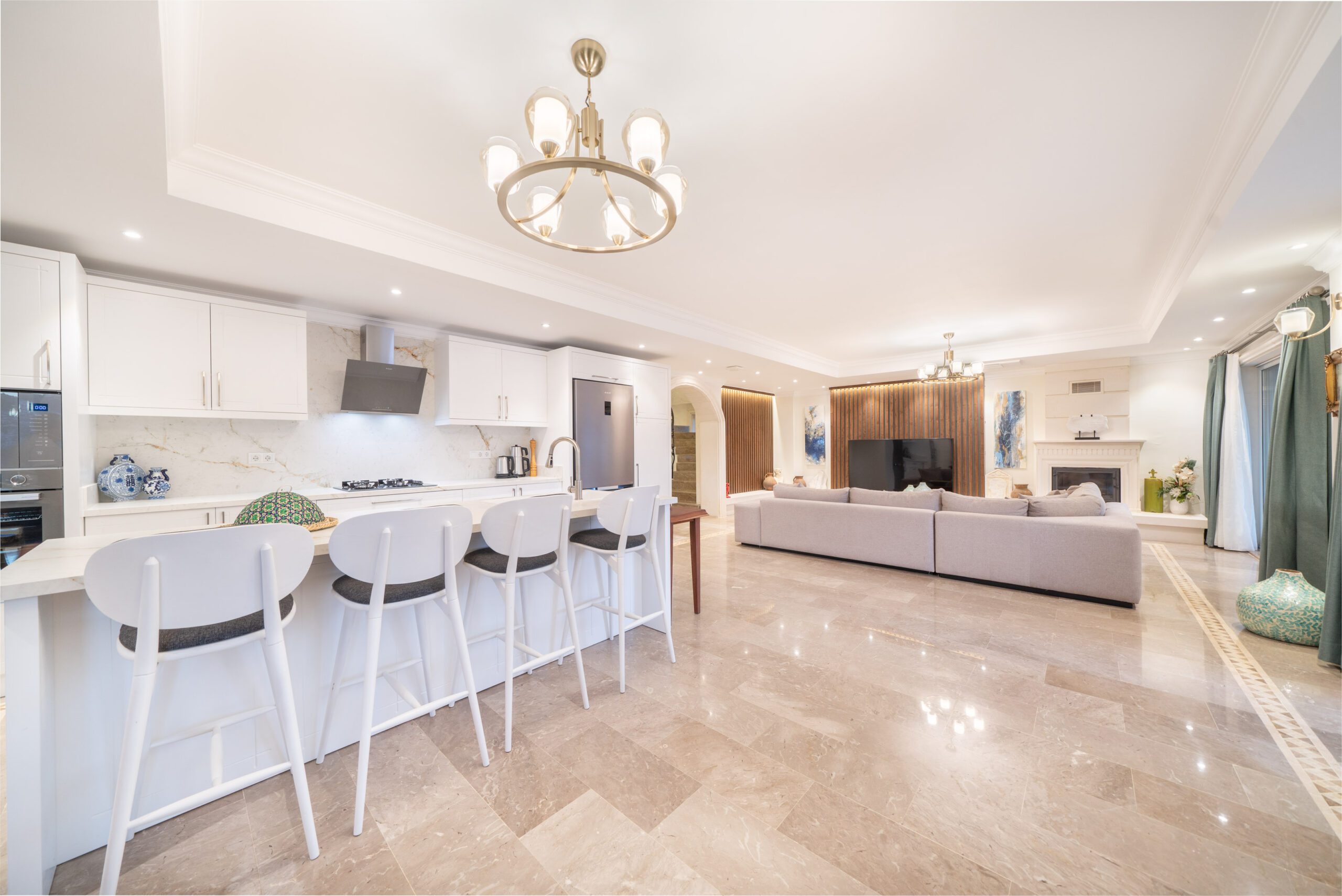 The villa’s open-plan interior comprises the kitchen, dining, and lounge areas into a bright and welcoming communal space. At its heart, a generous L-shaped sofa faces a SMART flat-screen TV, offering the perfect place to unwind in comfort. Floor-to-ceiling sliding glass doors bathe the room in natural light and open directly onto the pool terrace, effortlessly connecting indoor and outdoor living.