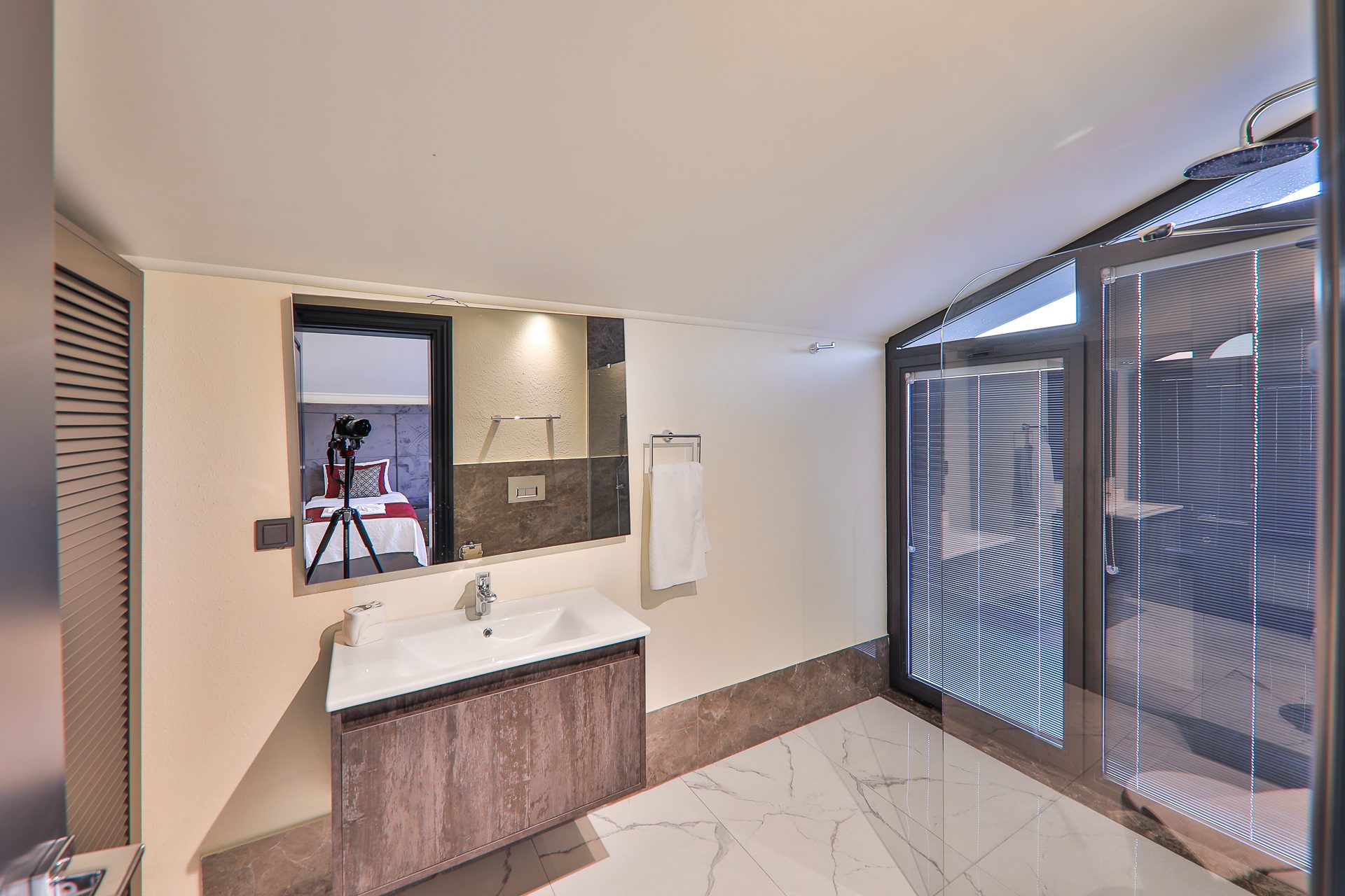 Bedroom 5, Third Floor – This bedroom features two single beds, en-suite bathroom, wardrobes, TV, and access to the roof terrace where you will find sun loungers and a seating area, the ideal vantage point for a sundowner while soaking in the Kalkan sunsets.
