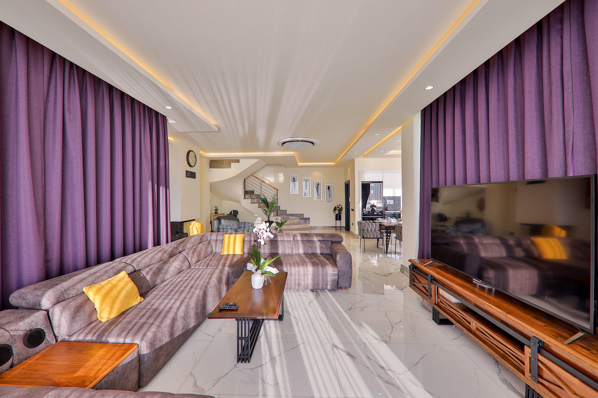 The living areas at Villa Ayala are light-filled and elegant, featuring an open-plan layout with designer furnishings, an equipped modern kitchen, and seamless access to the pool terrace.