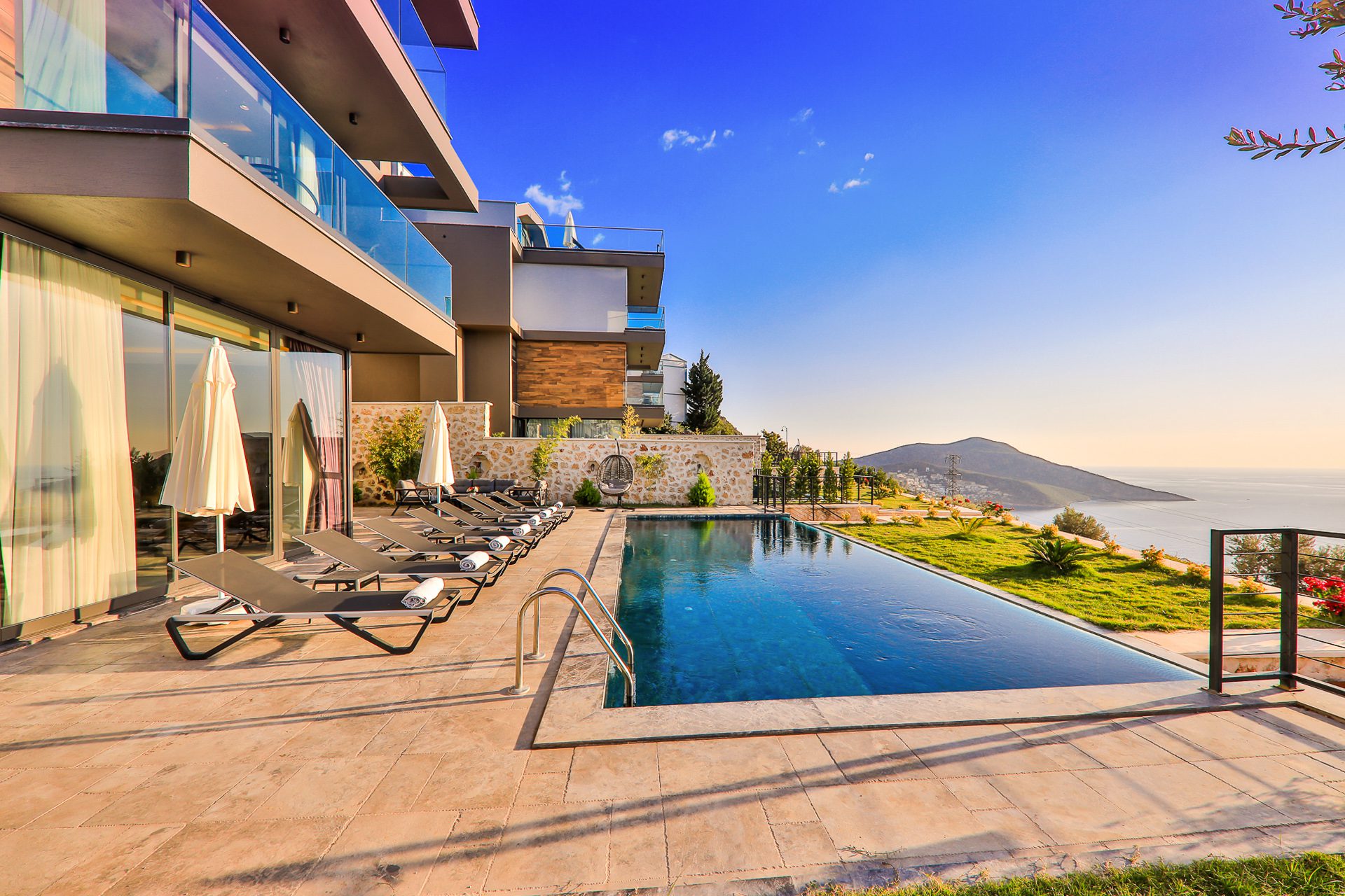 - Private infinity pool (which can be heated at an additional cost) with sun loungers and sea views