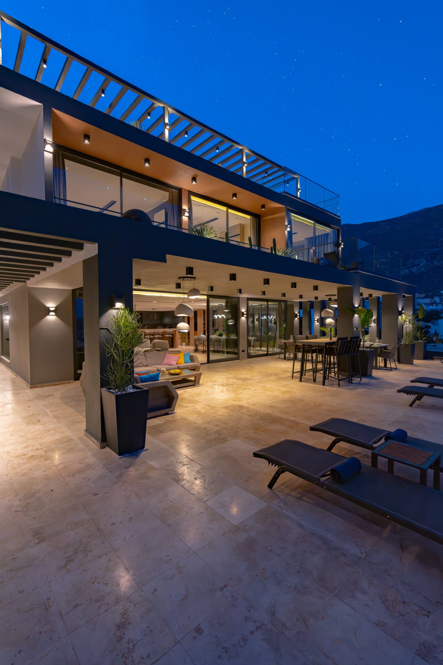 • Expansive pool terrace with sun loungers, parasols, and daybeds