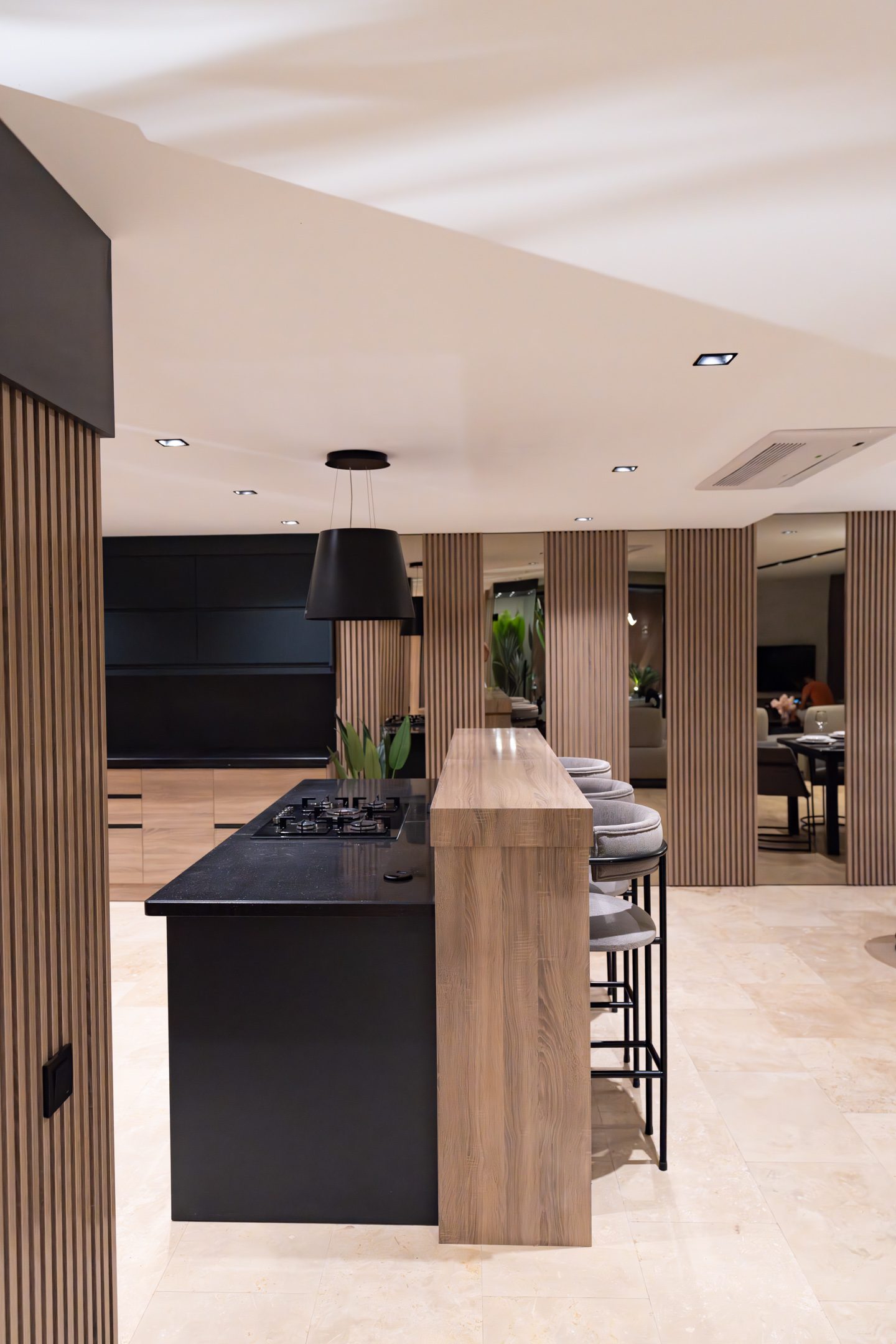 The spacious living area flows into a modern kitchen and indoor dining space, whilst outside, the pool terrace is the spotlight. Guests can soak up the sun on cushioned sun loungers, relax on double daybeds, or unwind in the infinity pool with a built-in Jacuzzi, all while enjoying panoramic views across the Bay.