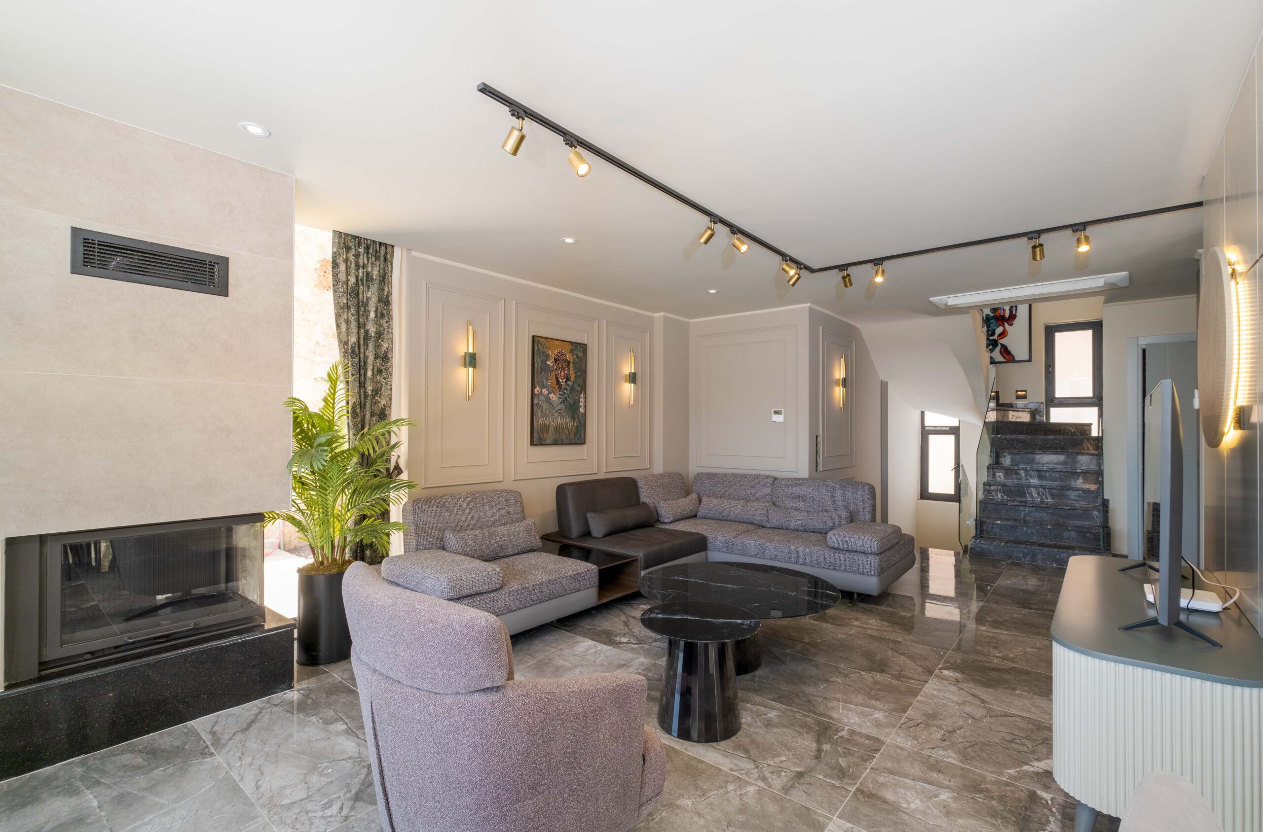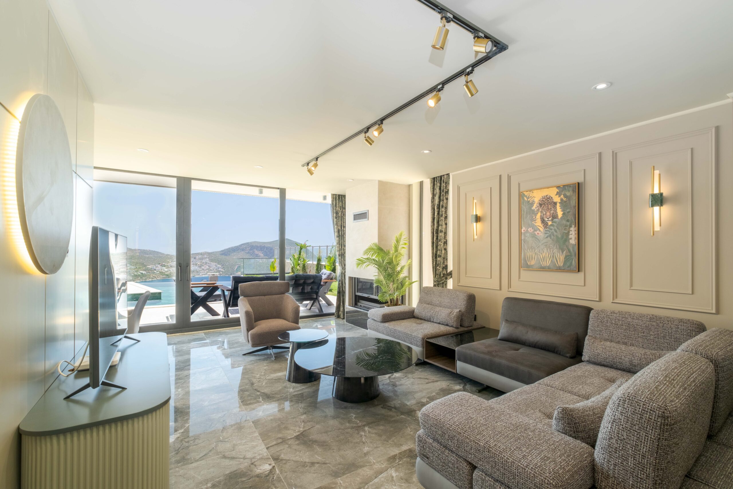 The ground floor features a bright open-plan living space with sea views and direct access to the pool terrace. The lounge area offers comfortable seating, a TV, air conditioning and a fireplace, creating a cosy environment whether visiting in summer or the cooler months.