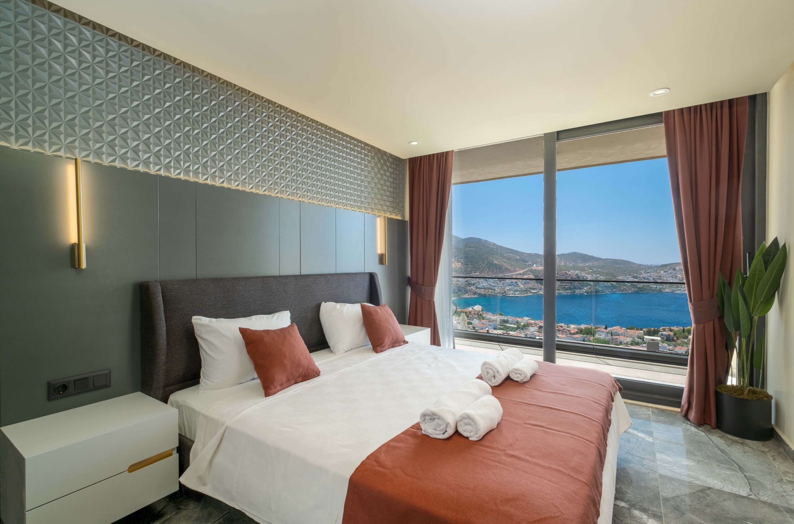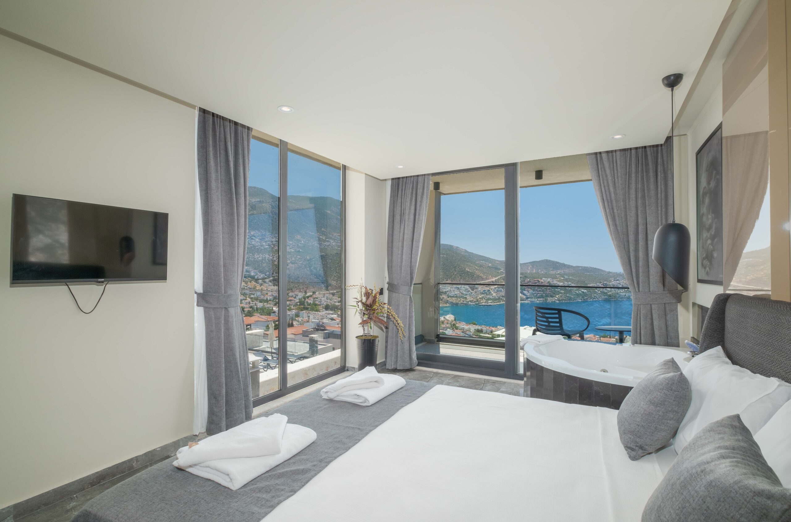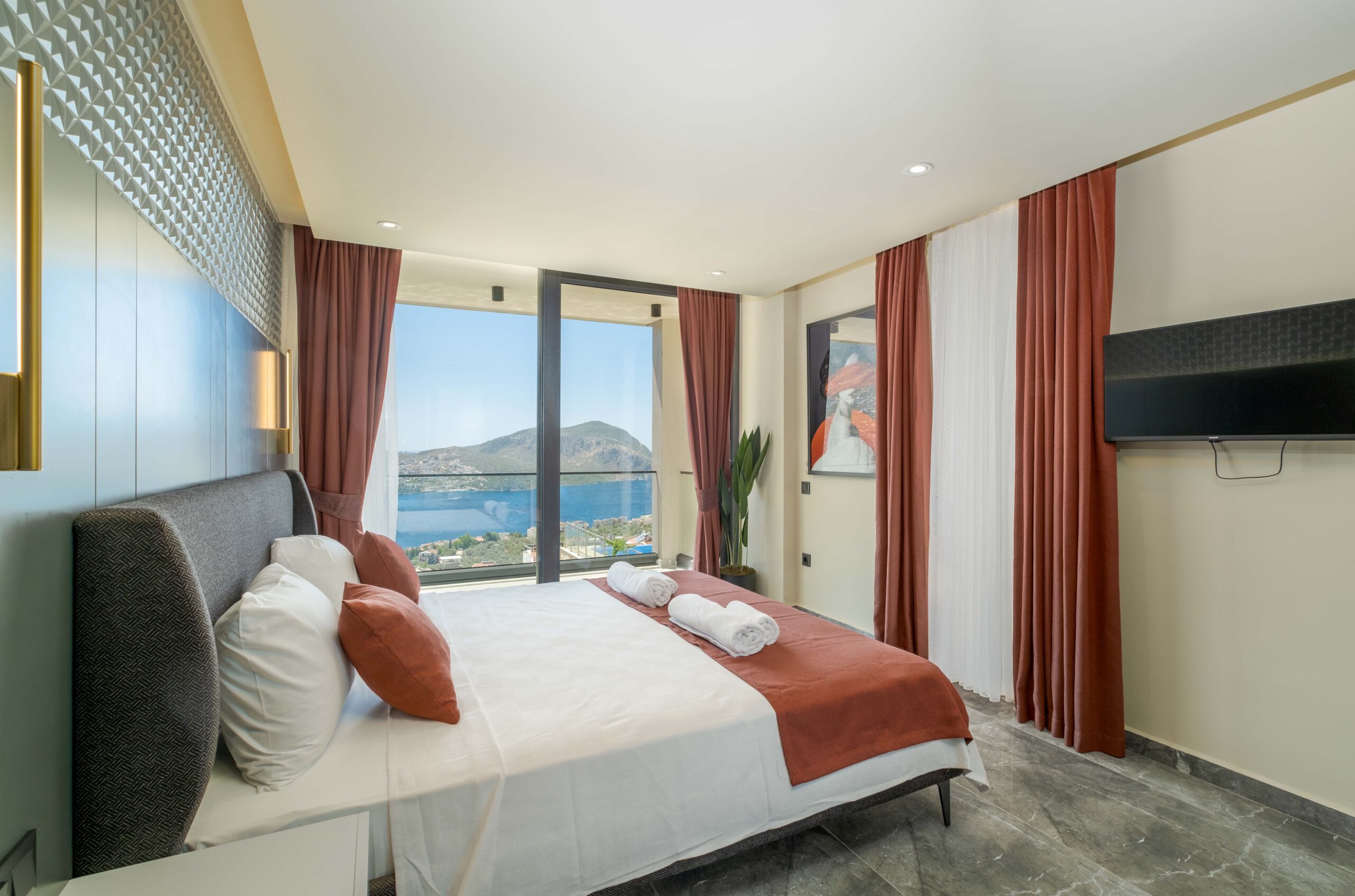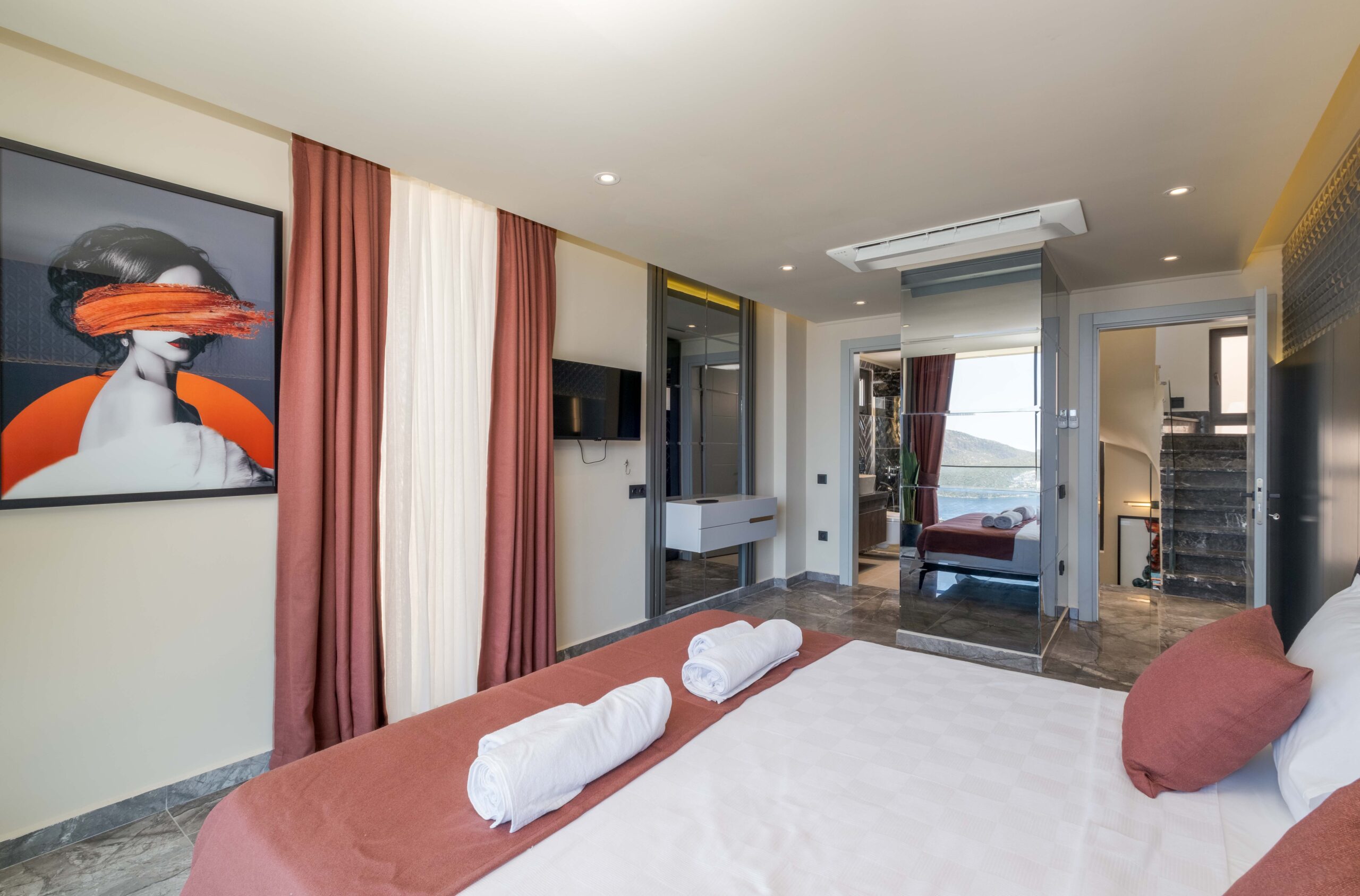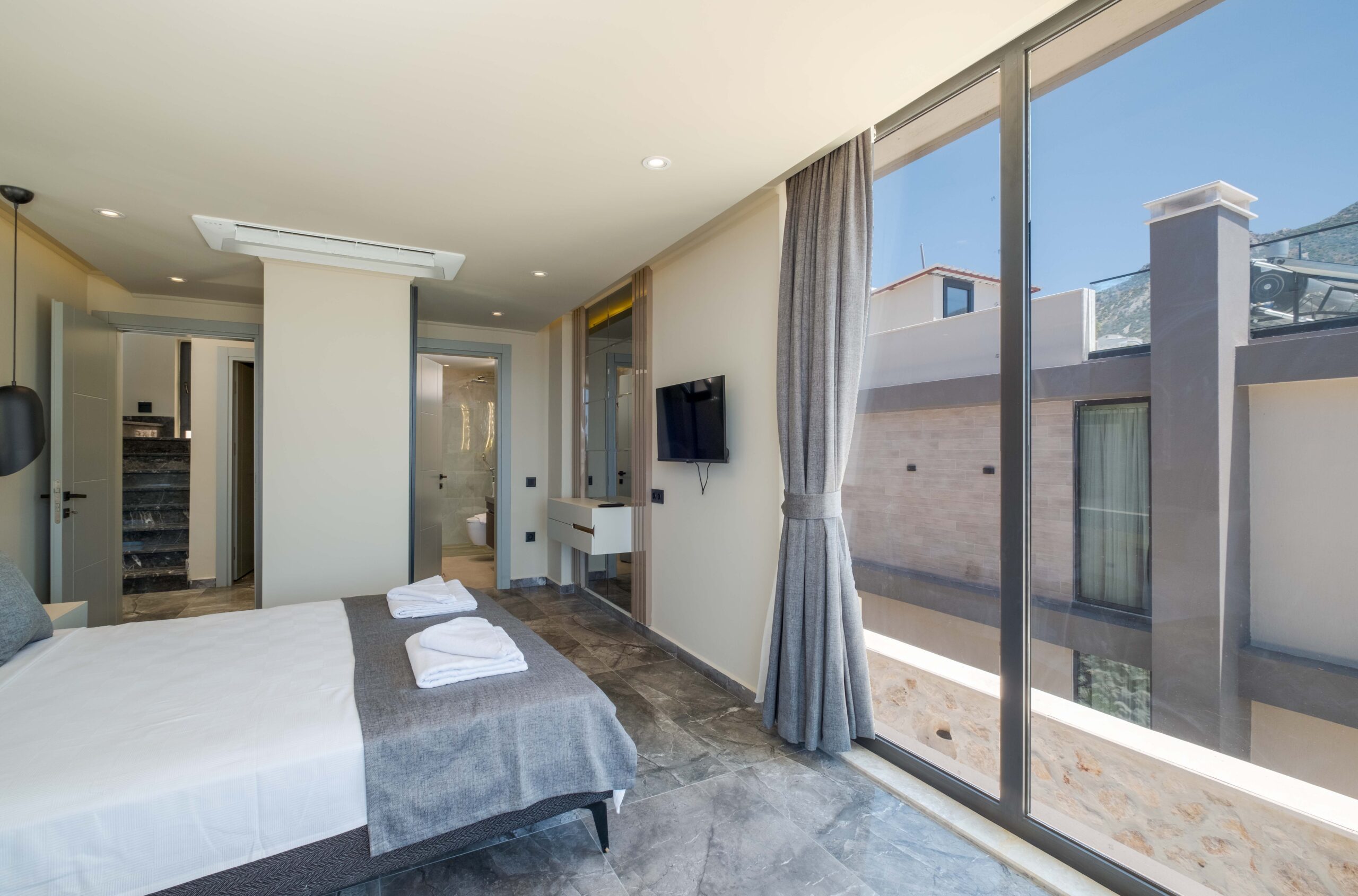 The third bedroom is situated on the lower floor and offers a similarly generous layout, complete with its own en-suite bathroom featuring a Jacuzzi and a TV for added comfort. Throughout the villa, the bedrooms have been styled to create a calm and restful atmosphere, ensuring guests can fully unwind and enjoy a tranquil stay in beautiful Kalkan.