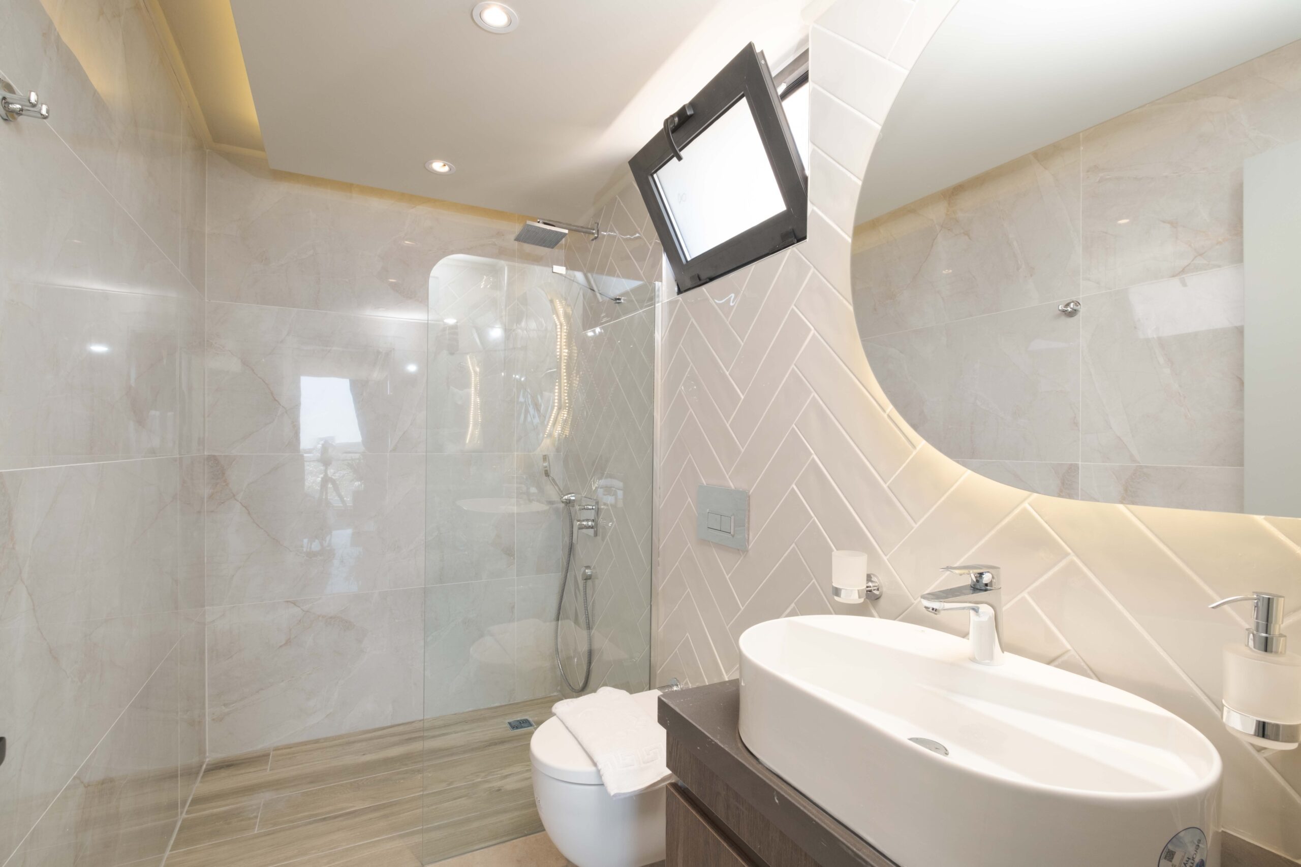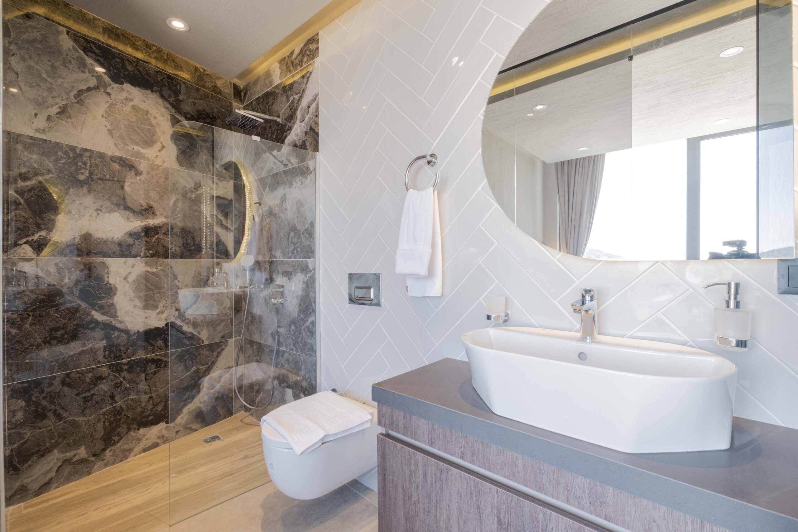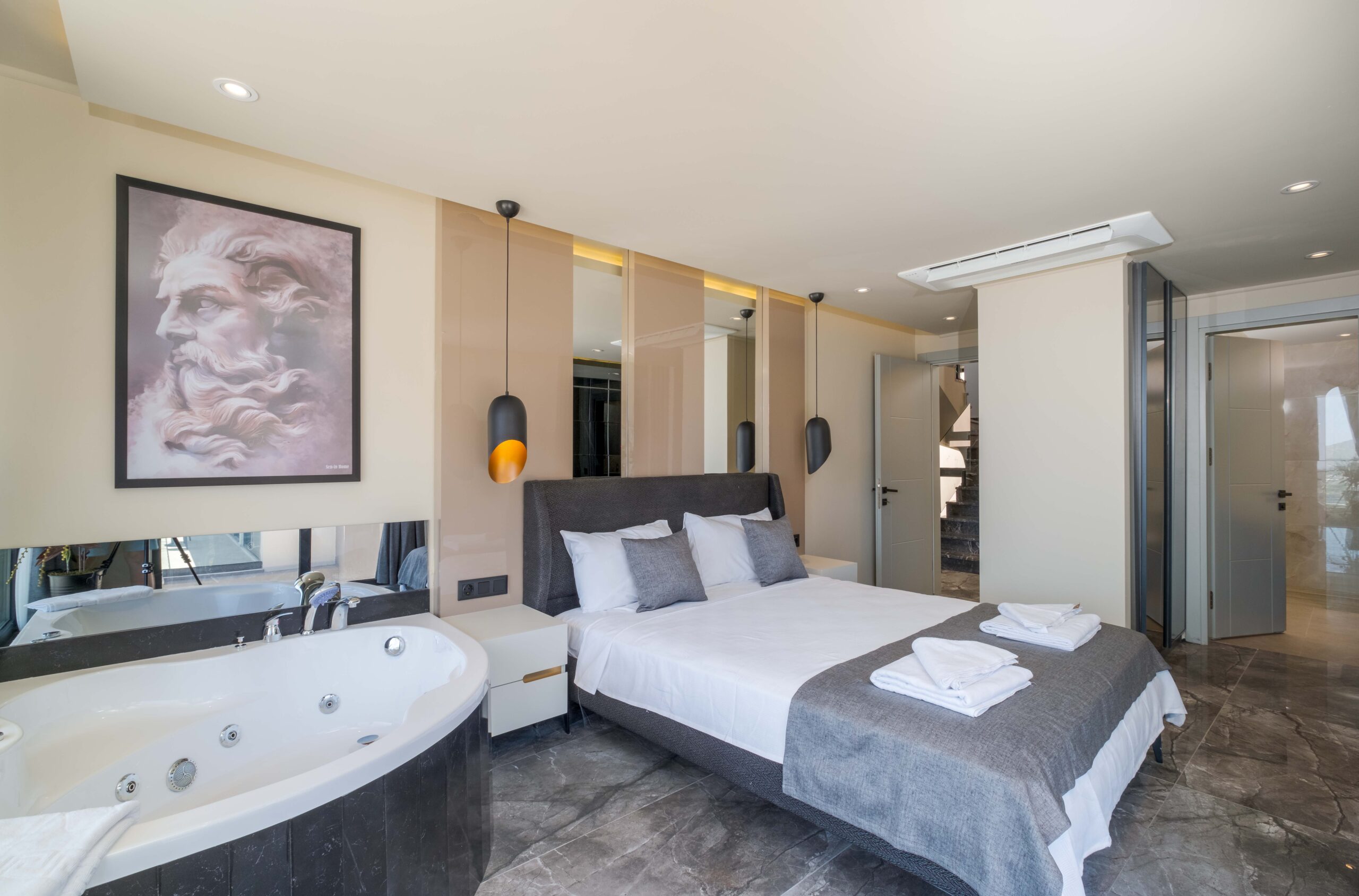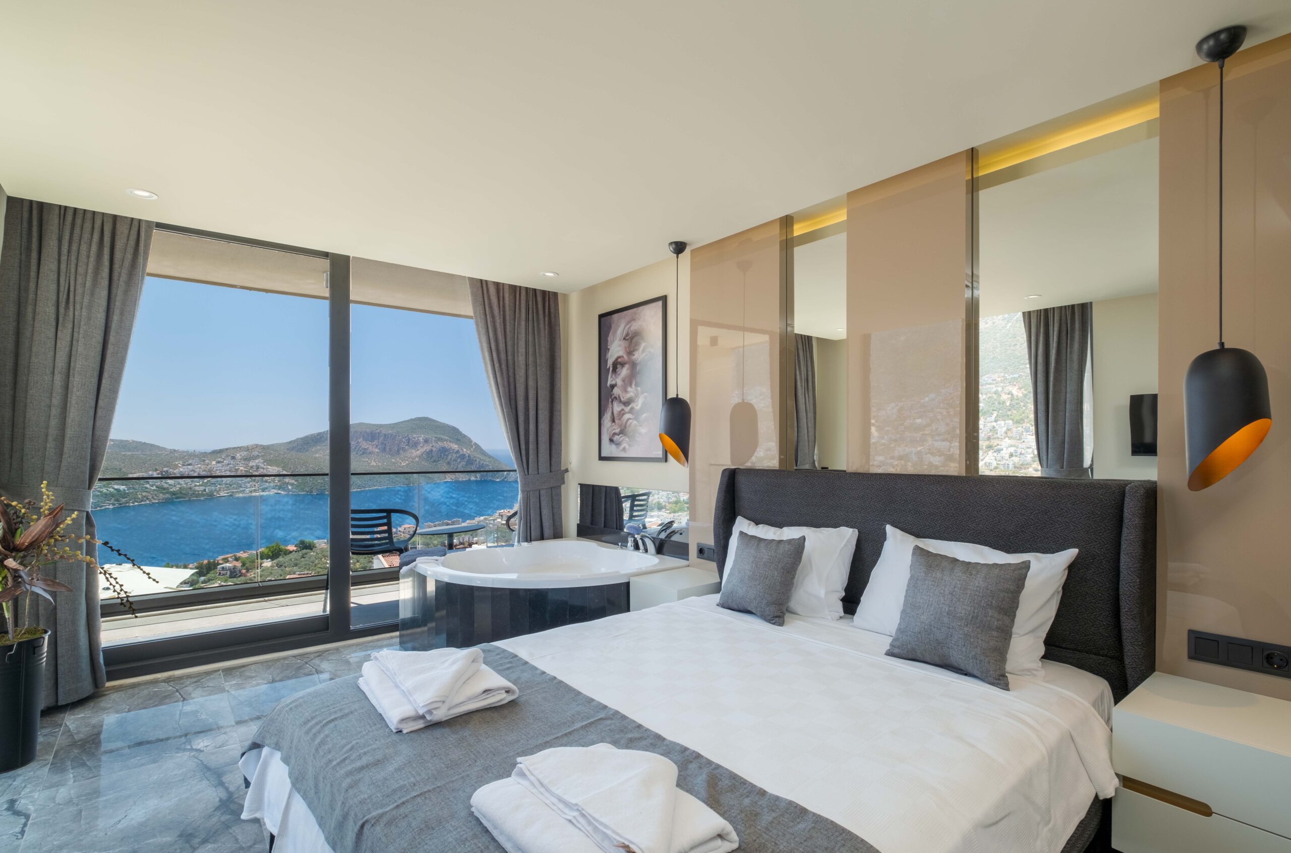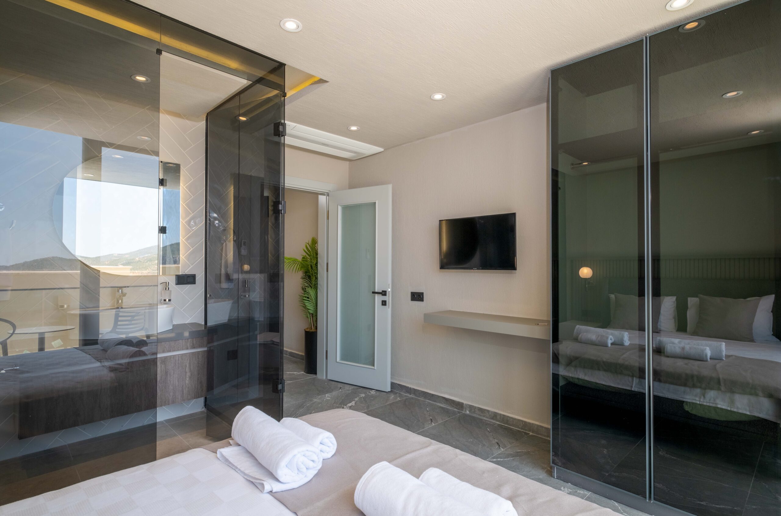 The third bedroom is situated on the lower floor and offers a similarly generous layout, complete with its own en-suite bathroom featuring a Jacuzzi and a TV for added comfort. Throughout the villa, the bedrooms have been styled to create a calm and restful atmosphere, ensuring guests can fully unwind and enjoy a tranquil stay in beautiful Kalkan.