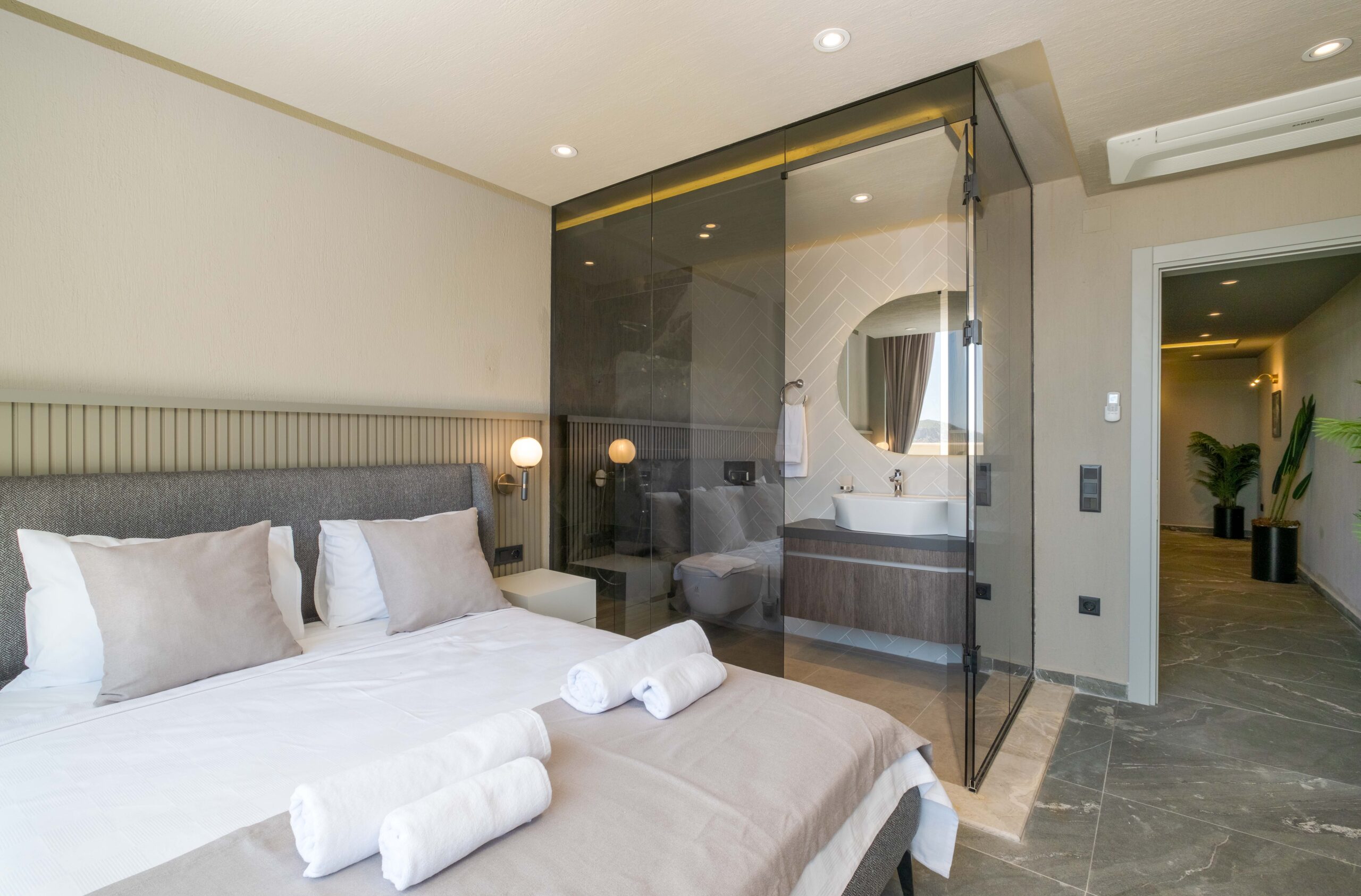 Villa Casa Sirius features three spacious en-suite bedrooms, each designed to provide comfort and privacy. Two double bedrooms are located on the first floor, both benefiting from private balconies that offer a peaceful spot to enjoy the views. One of these rooms includes a luxurious Jacuzzi within the en-suite bathroom, adding an extra element of indulgence.