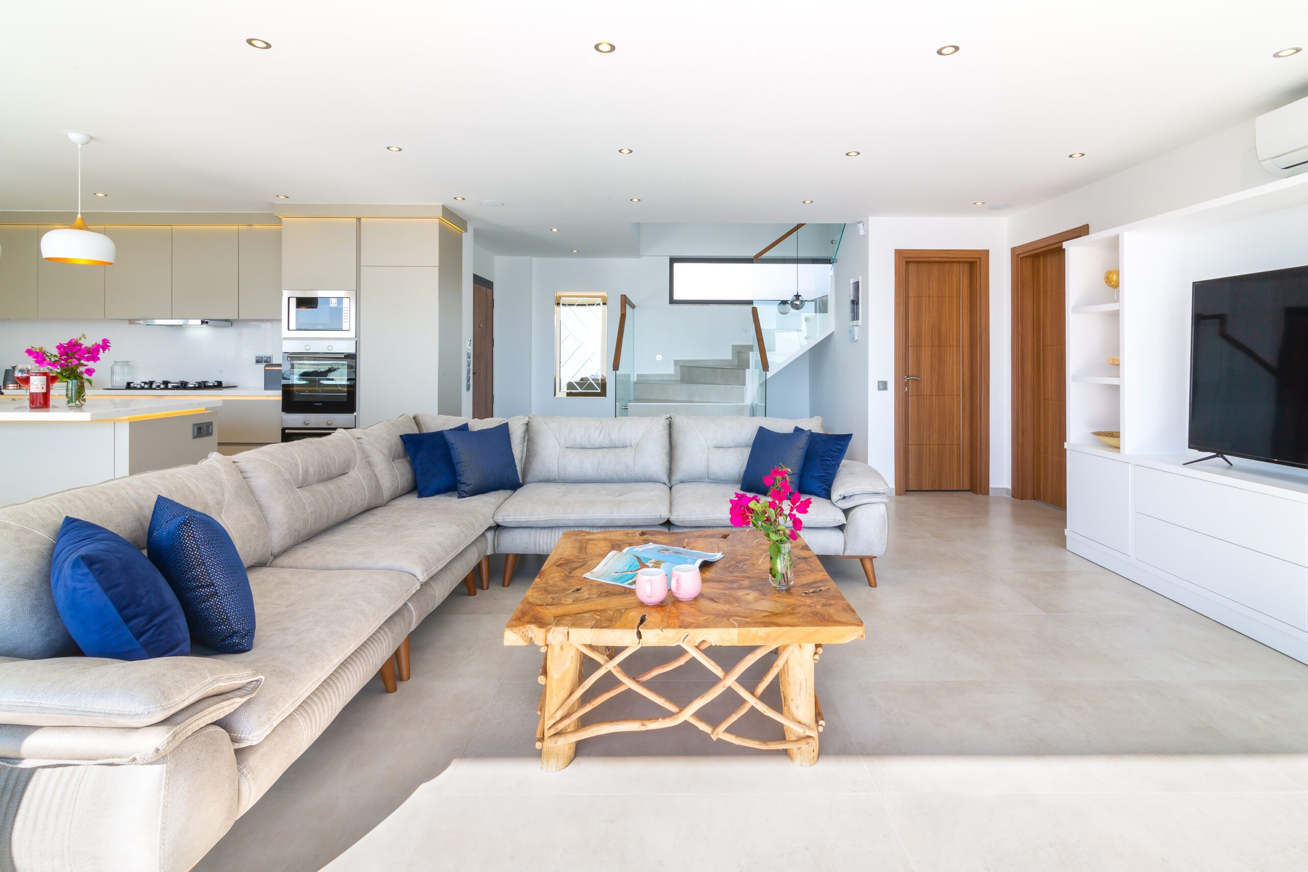 The interior living spaces are both elegant and welcoming. The spacious lounge is beautifully furnished and enjoys stunning sea views, making it an inviting place to relax at any time of day. A large flat-screen TV with streaming services provides entertainment for those quieter evenings indoors.