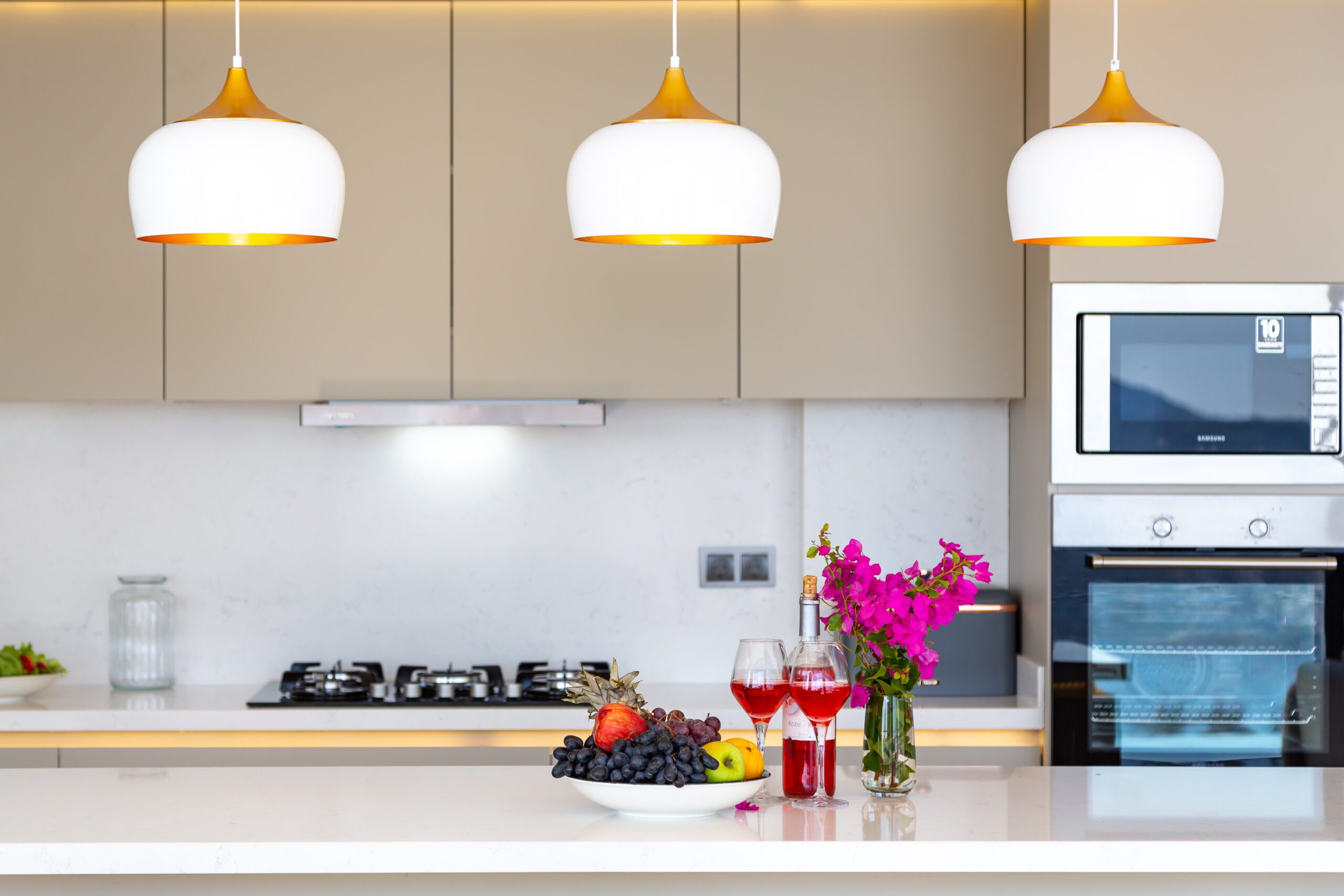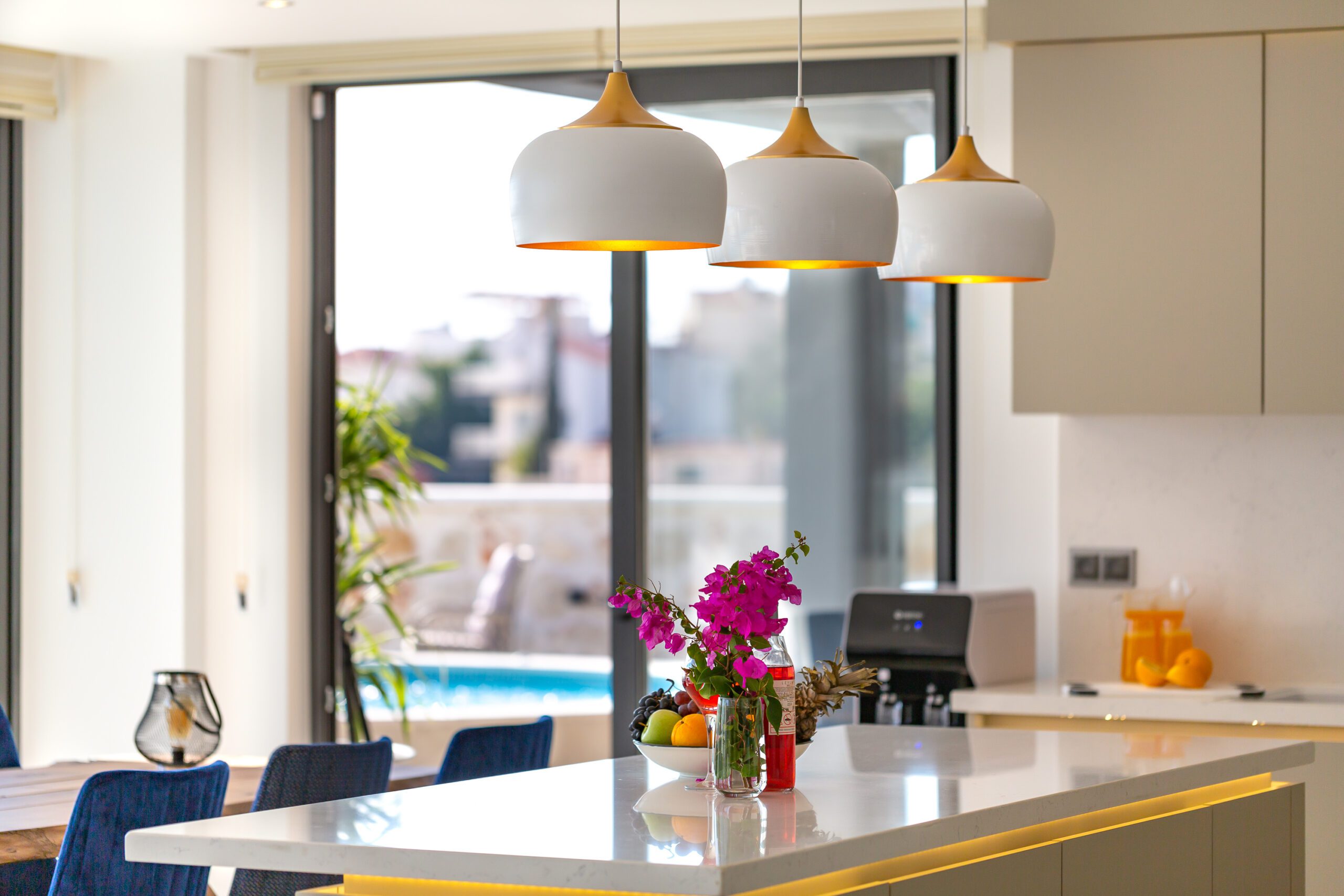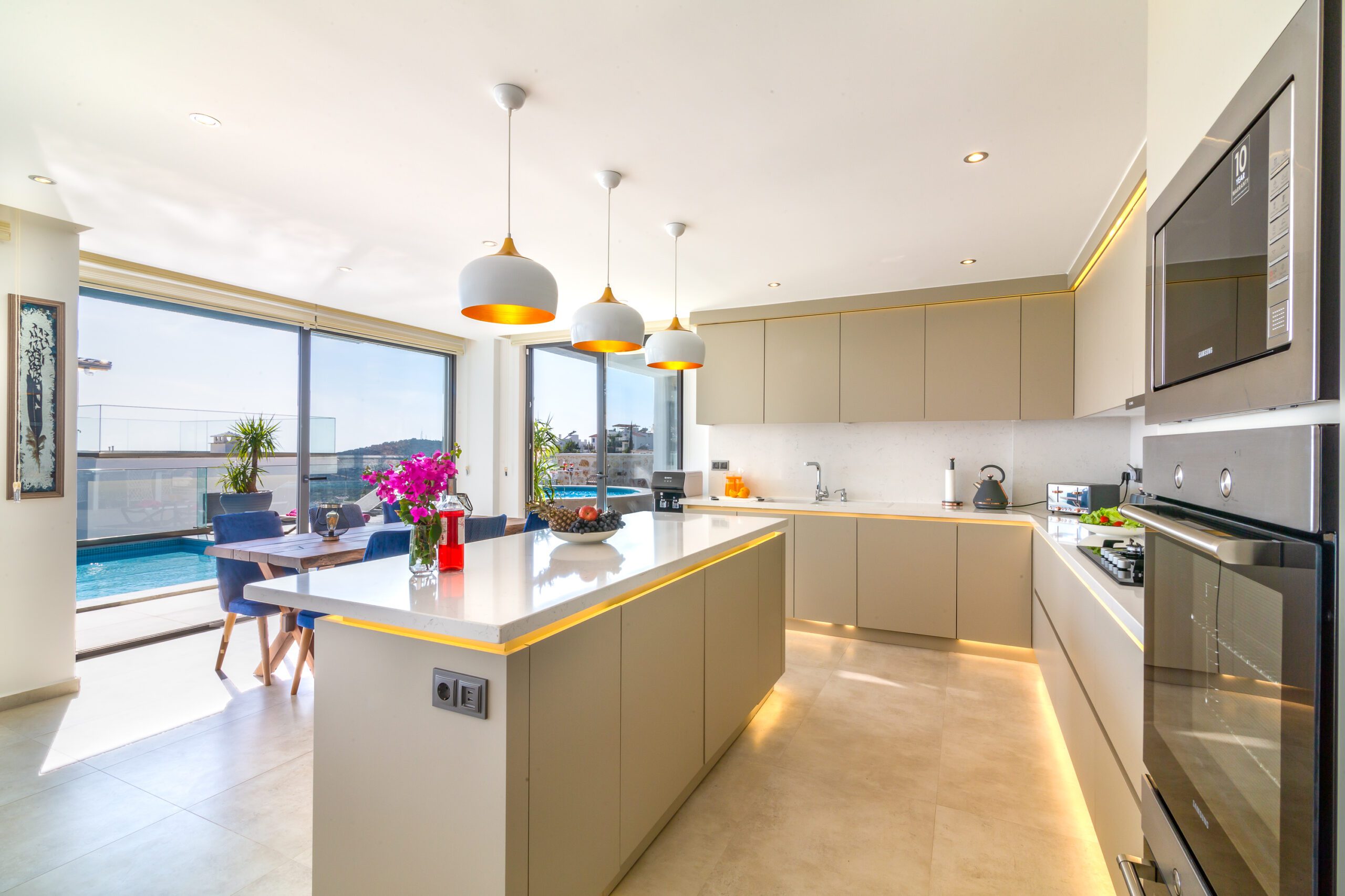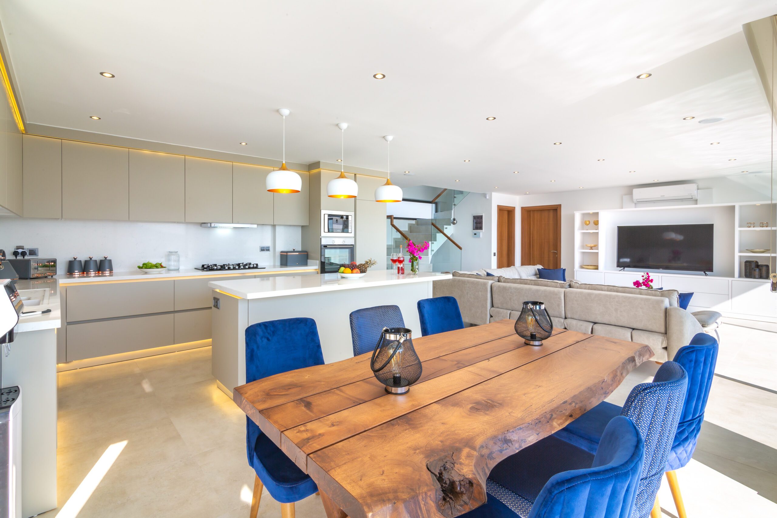 The modern, fully equipped kitchen has been thoughtfully designed with everything needed for self-catering, including 2 ovens, microwave, tall fridge, 2 under counter freezers, dishwasher and water cooler all complemented by a separate laundry room for added convenience. The open and airy layout makes the villa ideal for socialising while still offering plenty of space to unwind.