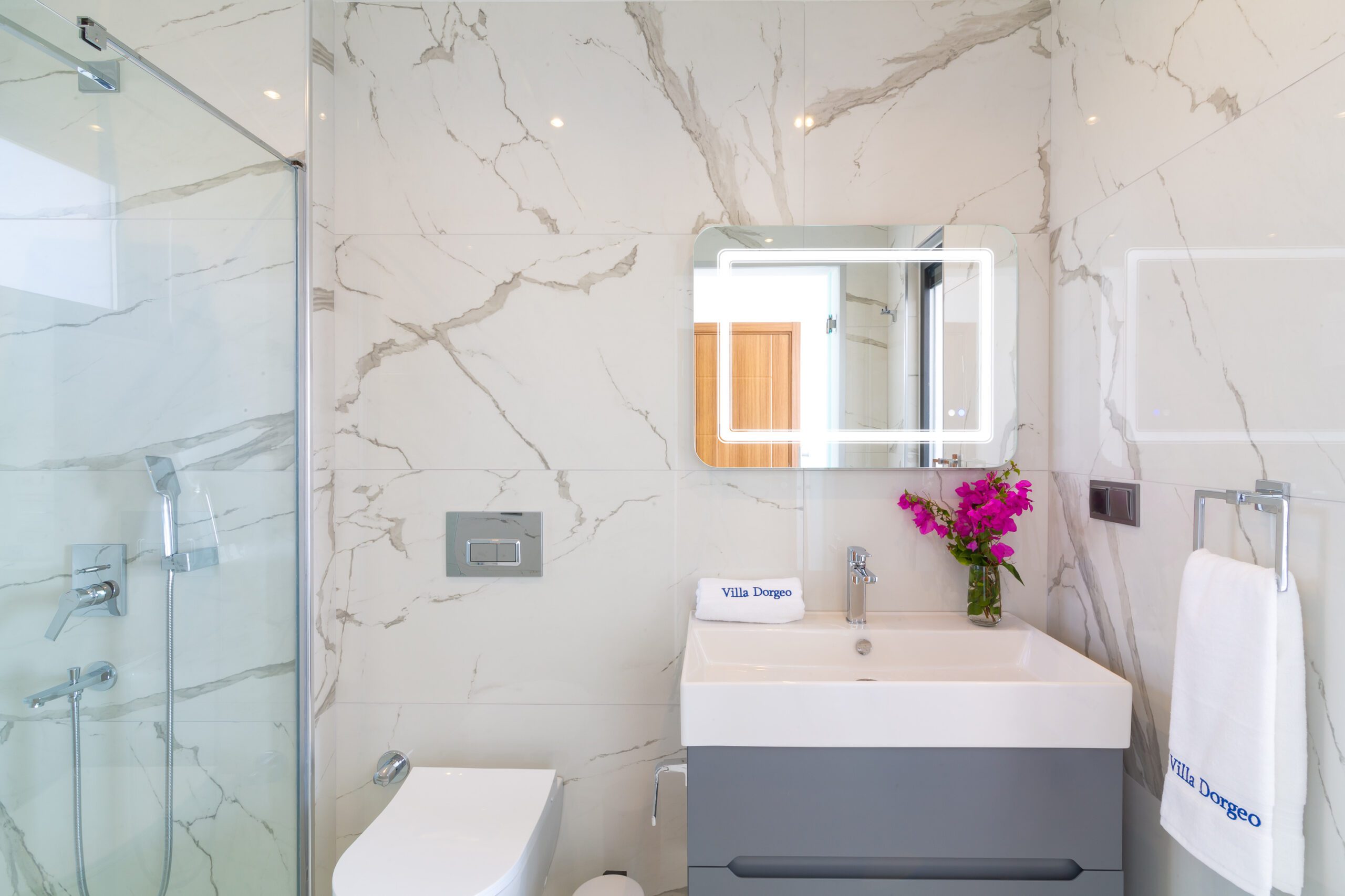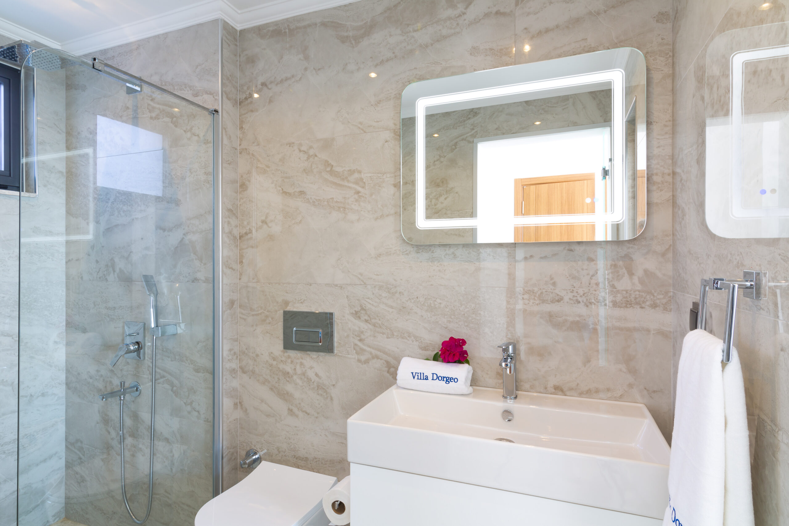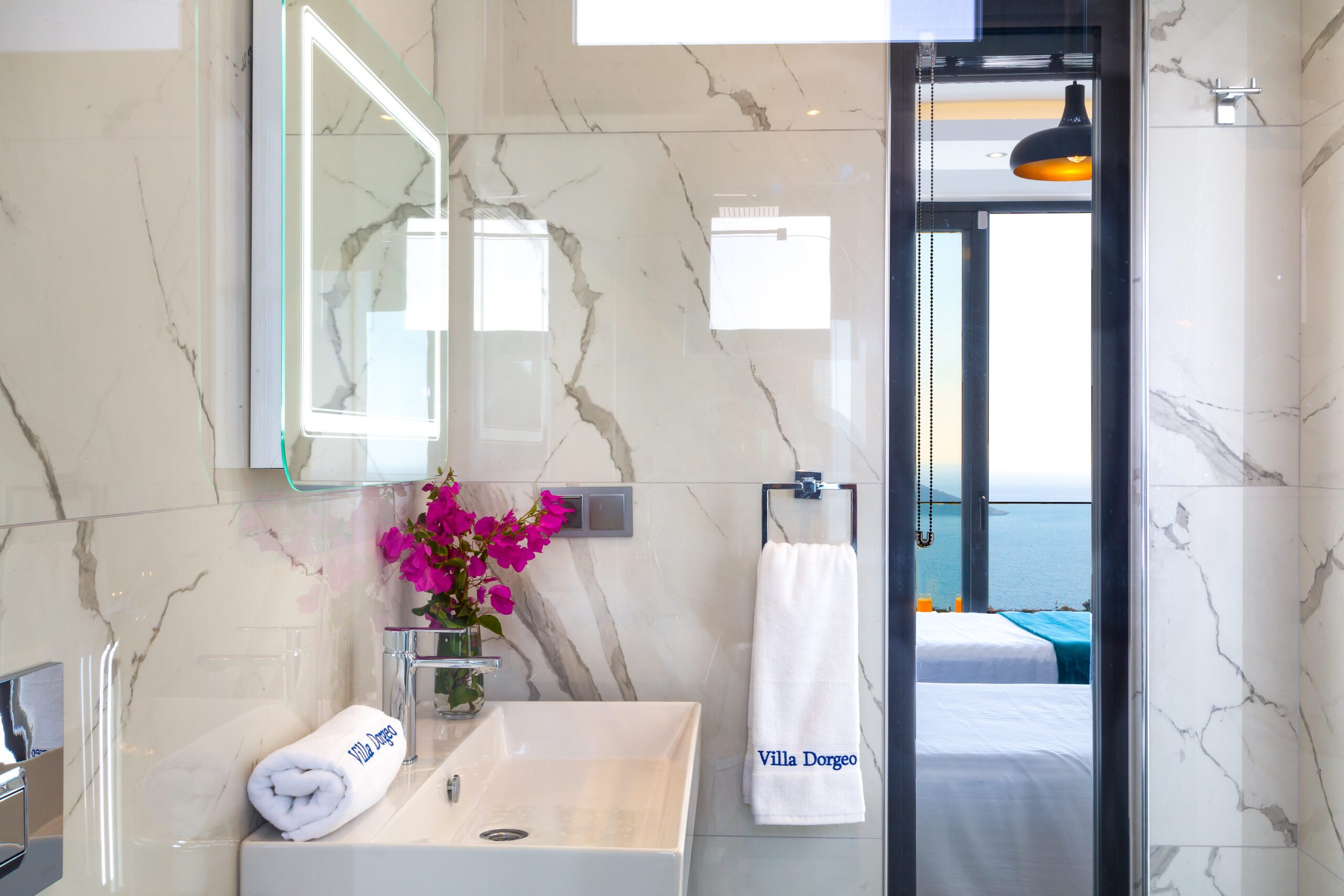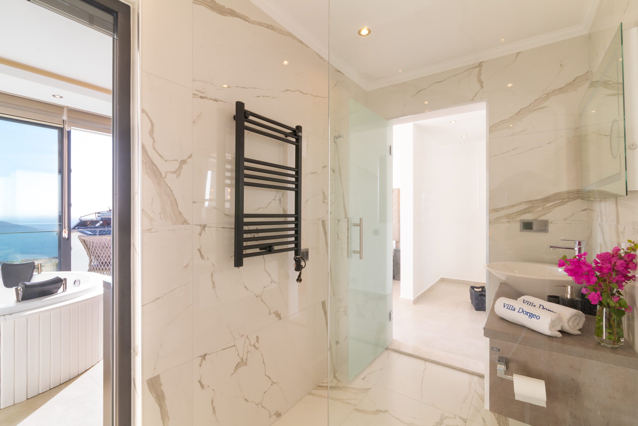 Villa Dorgeo offers four spacious en-suite double bedrooms, all finished to a high standard with excellent storage and access to balconies or terraces showcasing spectacular sea views. One bedroom is conveniently located on the ground floor, while the remaining rooms occupy the upper levels, enjoying truly breathtaking elevated views across the harbour.