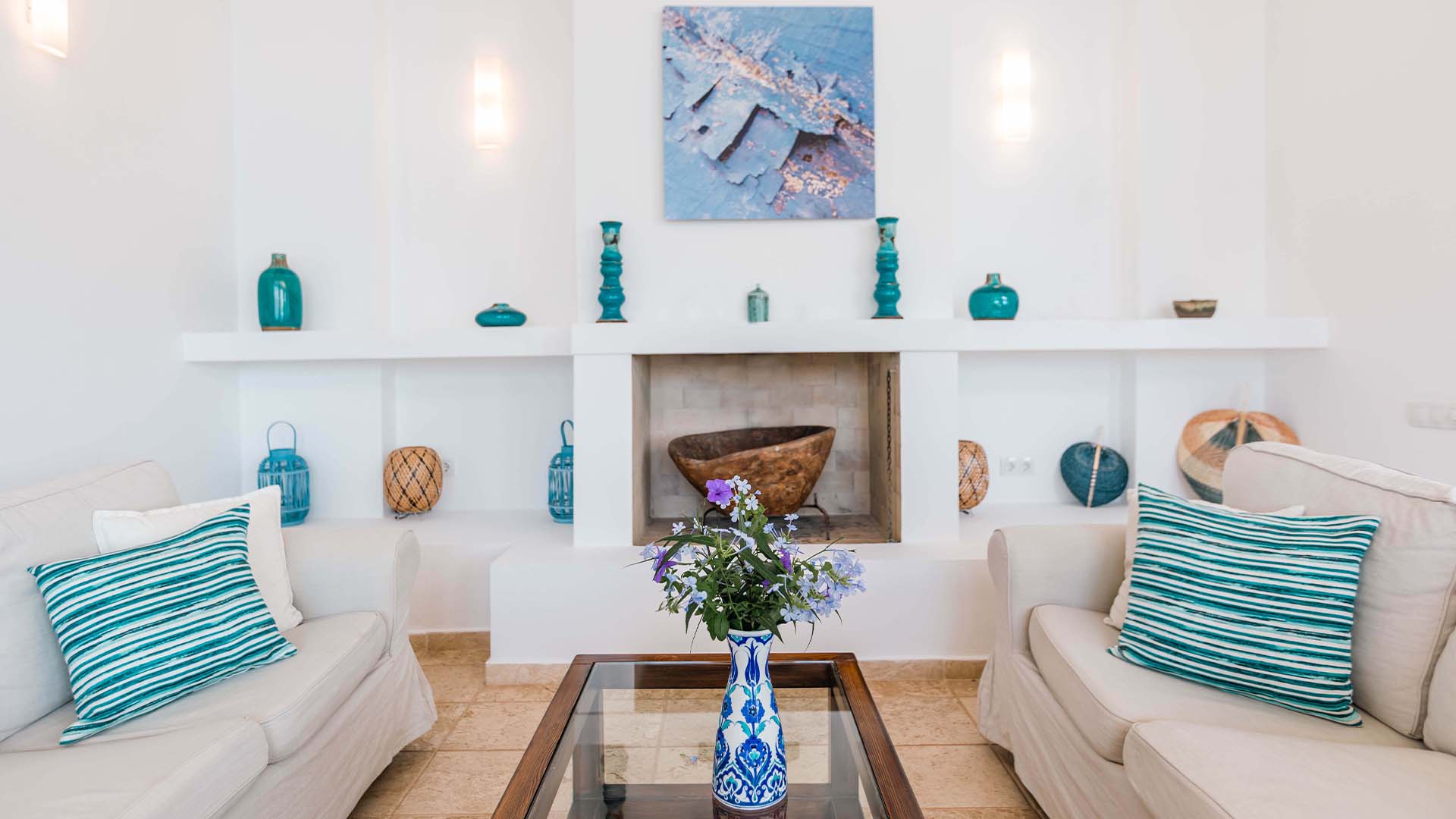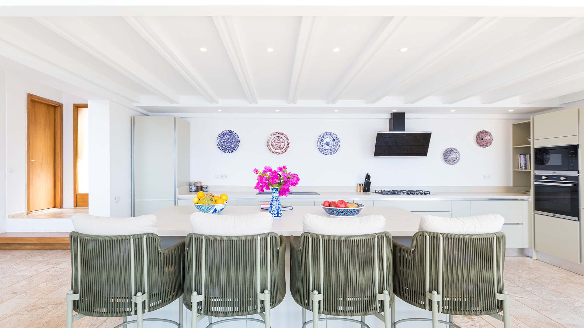 A large living space across the full length of the villa housing a stylish sitting room with concealed TV, well equipped kitchen with island and bar stools, indoor dining area and direct access to an outdoor dining area in which to dine al fresco and enjoy the fabulous sunsets.