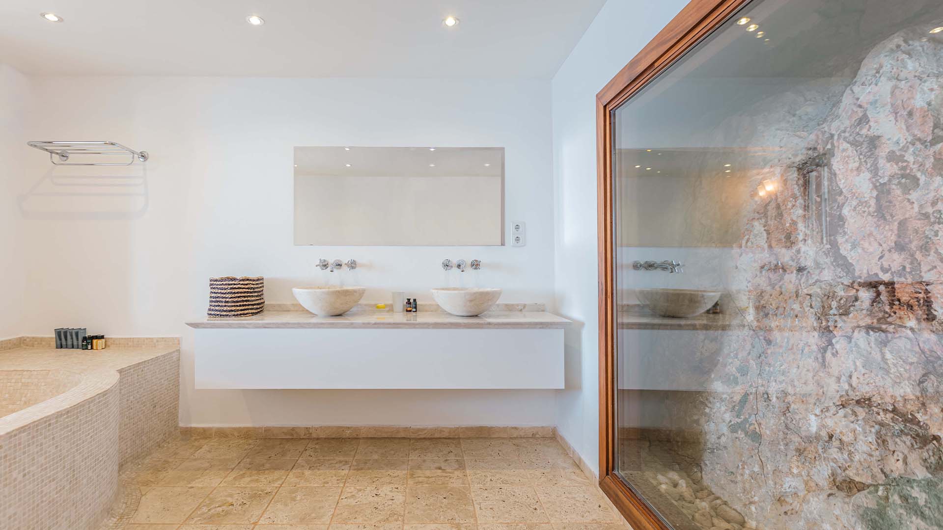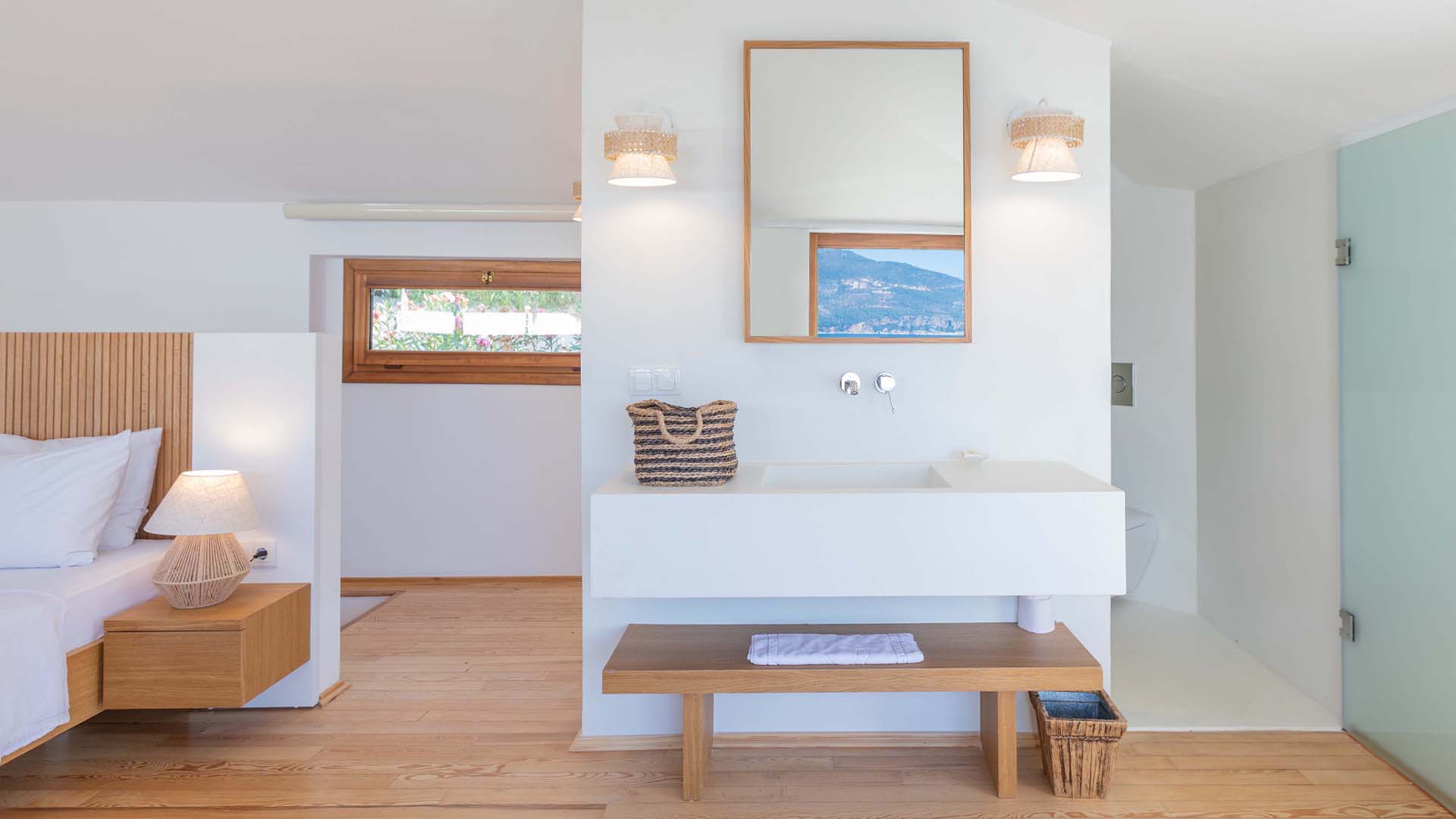 Villa Gunbatimi is one of four elegant, 3-bedroom, all-en-suite, air-conditioned Villas, each with its own private infinity pool and all located on the pine-clad hillside grounds of the prestigious Hotel Villa Mahal. The Villa sits at the top of the Mahal Estate, with floor to ceiling windows and sliding doors giving uninterrupted sunset facing views of the Kalkan Bay – the Hotel was created by designer Ipek Tolbas whose attention to detail is evident everywhere from the elegant sweep of curved white walls through to the elegant modern interiors that enhance the space and compliment the natural light.