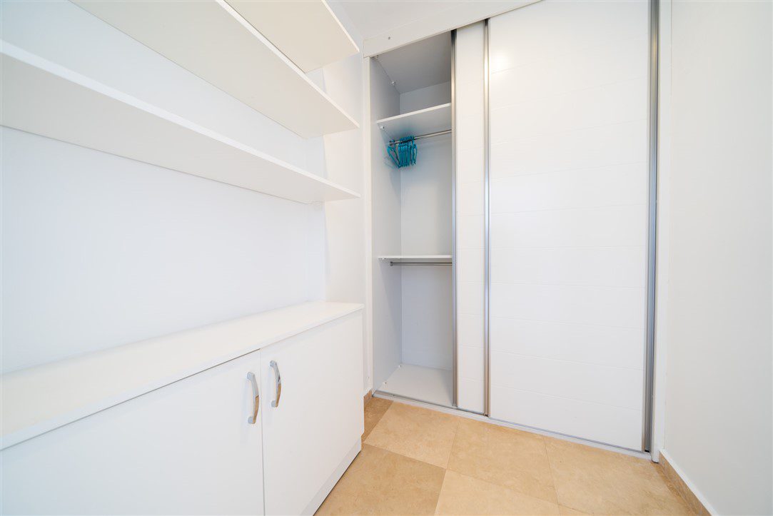 The open-plan living space on the ground floor is modern and welcoming, with comfortable seating, a satellite TV, DVD player and Bluetooth speaker. There’s a dining table adjacent to the sleek kitchen, well-equipped with appliances including a fridge/freezer with icemaker, oven, hob, dishwasher and microwave. Glass doors lead directly onto the pool terrace, offering easy movement between inside and out. A separate utility room houses the washing machine, iron and ironing board.
