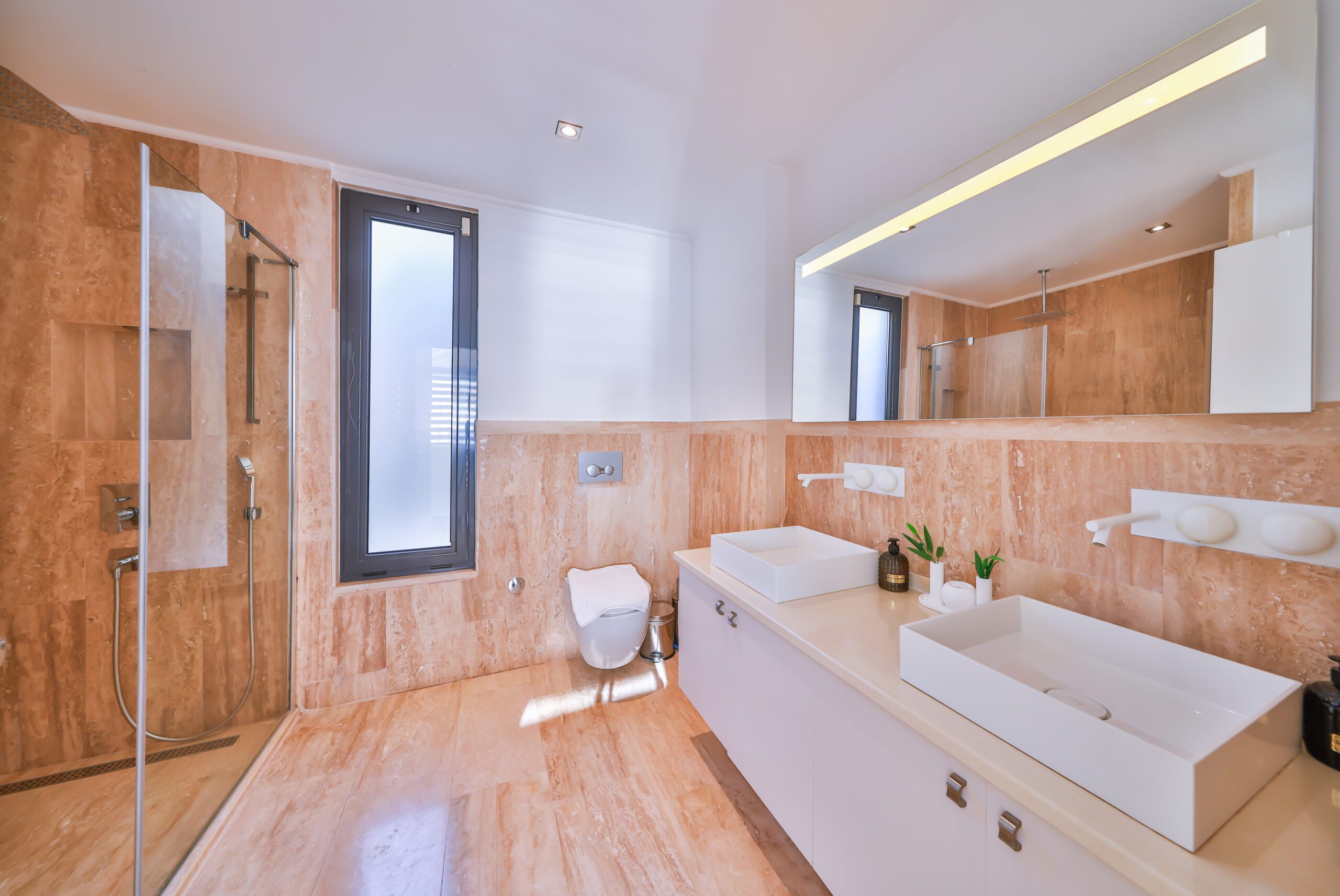 Villa Marvellous has five well-appointed bedrooms spread across three floors, each intended for maximum comfort and vistas. On the ground level, a double bedroom with an en-suite shower room leads onto the pool terrace, allowing guests to stroll outside and take in the breathtaking views of Kalamar Bay.