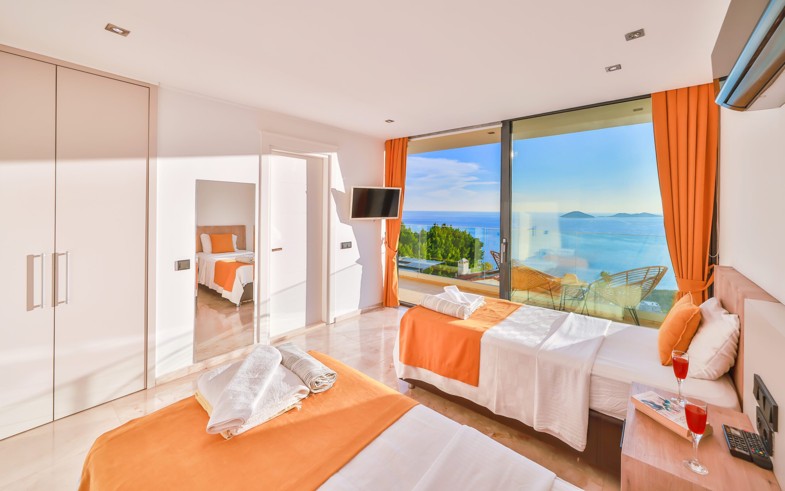 Villa Marvellous offers five well-appointed bedrooms arranged across three floors, each designed to maximise comfort and views. On the ground floor, a double bedroom with en-suite shower room opens directly onto the pool terrace, allowing guests to step outside and immediately enjoy the stunning outlook across Kalamar Bay. Ideal for guests who prefer a bedroom close to the pool terrace level.