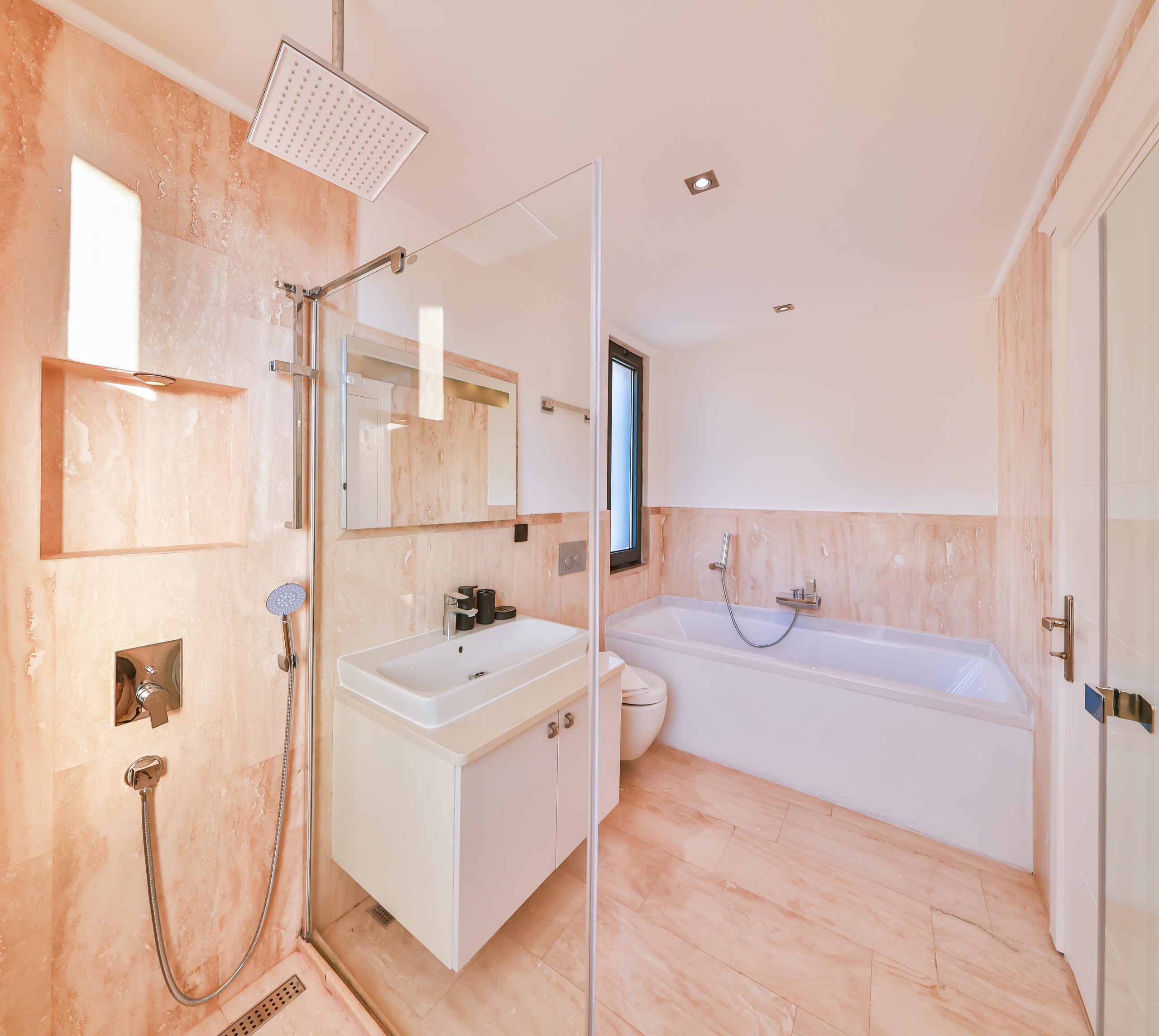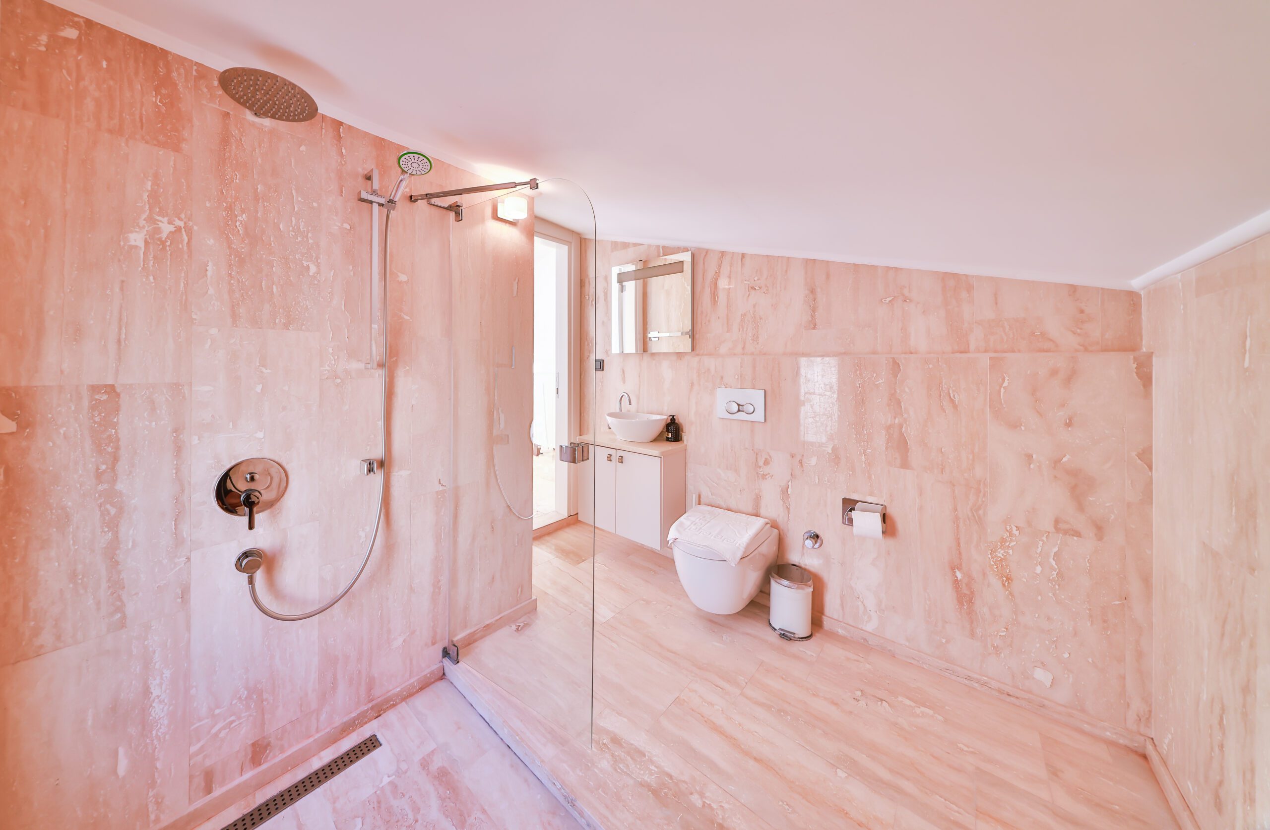 The upper floor has three additional bedrooms, two doubles and one twin, all with en-suite amenities and access to a communal balcony. Guests can unwind with a morning coffee while admiring the panoramic sea views. One of the double rooms has a bathroom with a bath and a separate shower, while the twin room has a bath and a separate shower, making this level ideal for families.