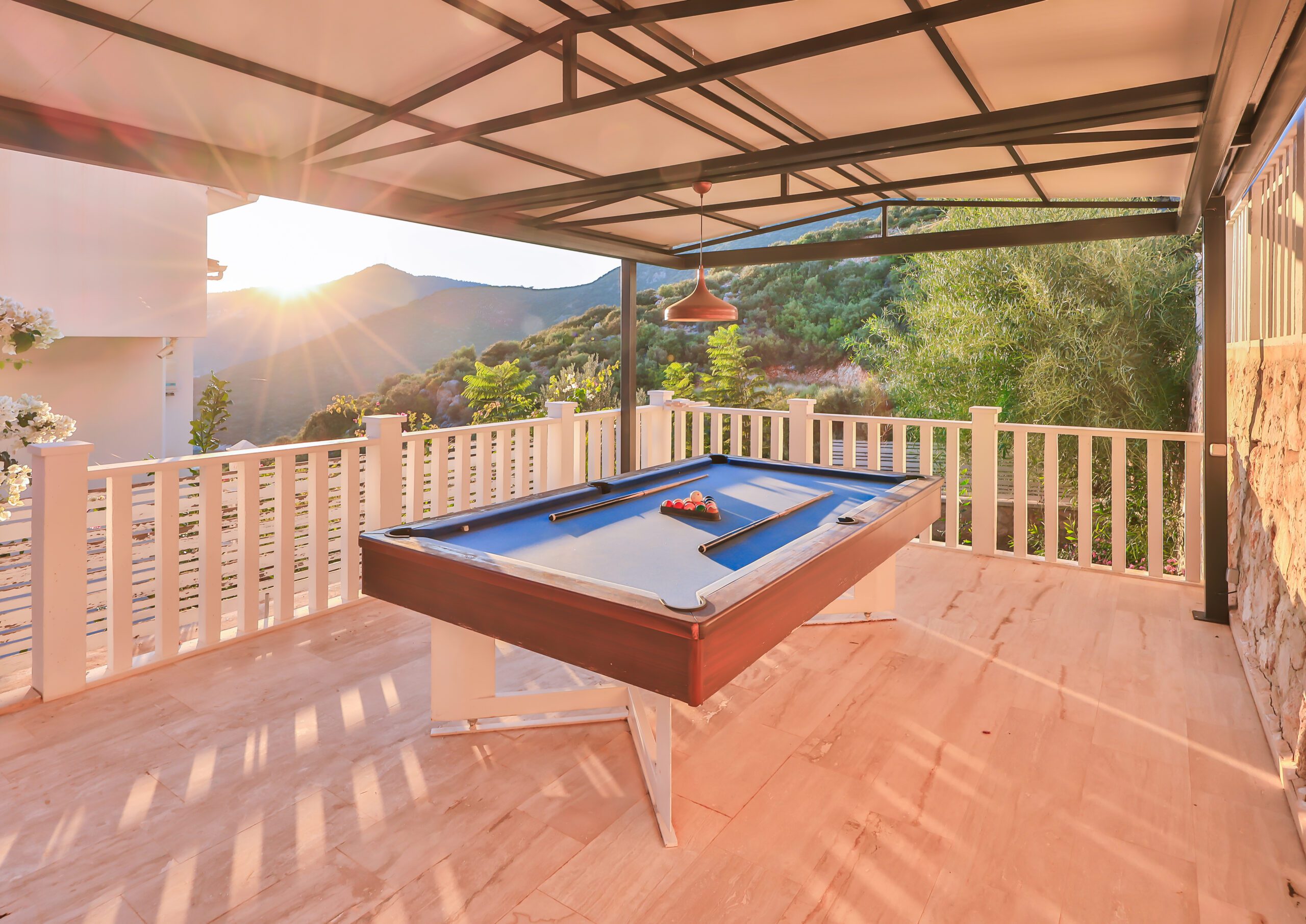 Sun loungers and parasols are positioned around the terrace, while a separate dining area to the side of the villa, shaded underneath a pergola, comfortably seats eight guests and includes a built-in BBQ, outdoor sink and food preparation area for effortless al-fresco dining. A large L-shaped sofa and coffee table provide another inviting space to sit back and take in the mountain and sea views. For those feeling energetic, table tennis is available at the rear of the villa.