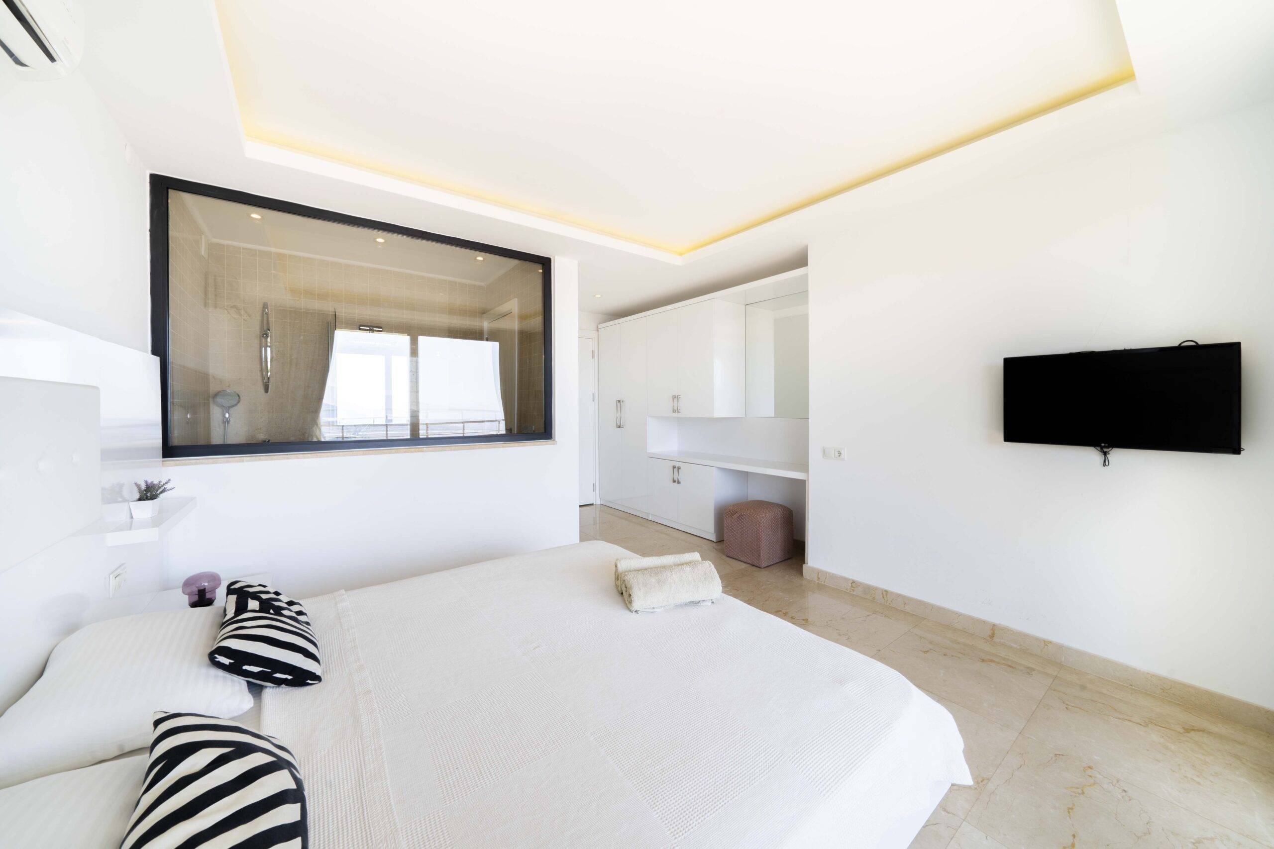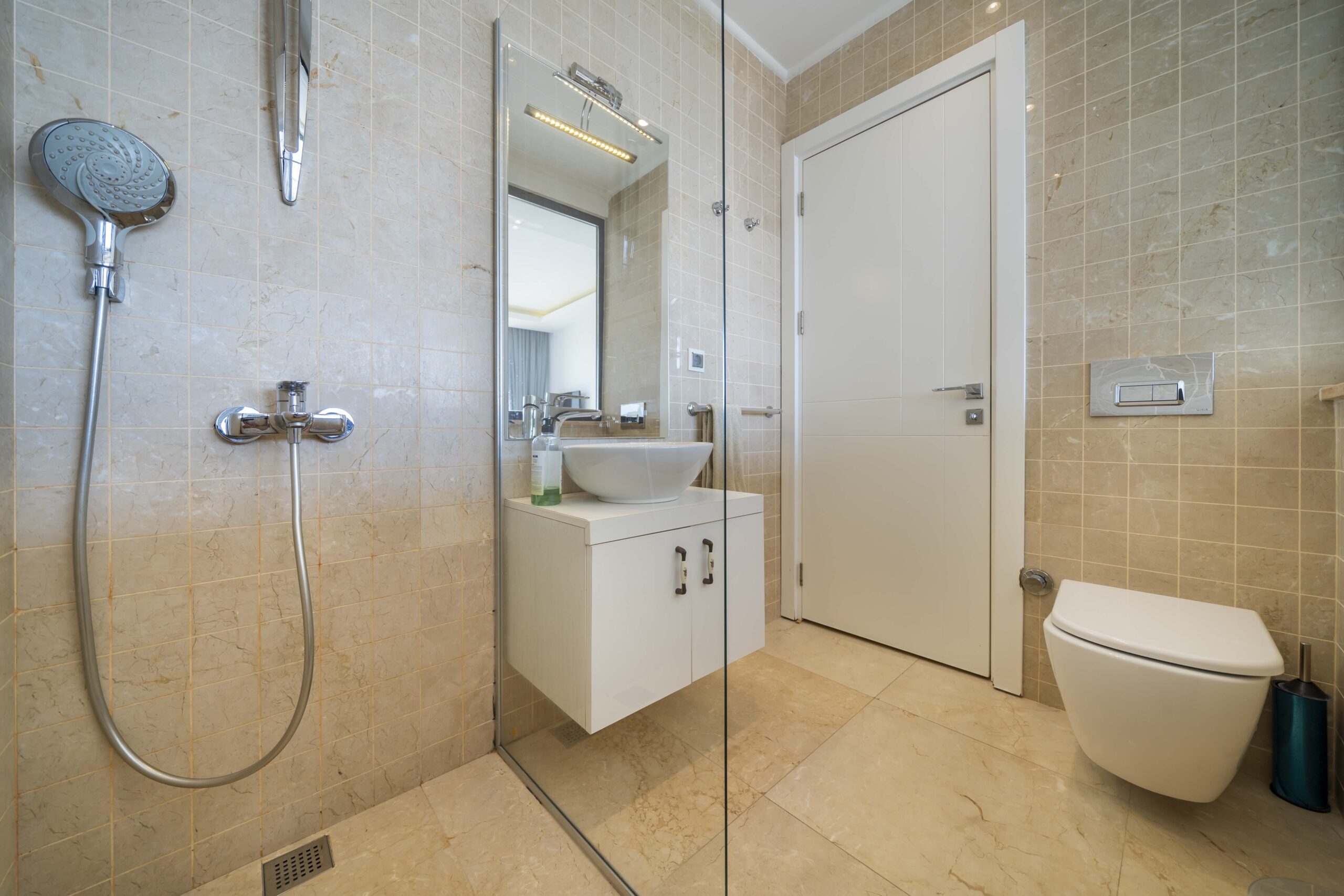 Adjoining the living space, the bedroom continues the villa’s serene, contemporary feel. Decorated in crisp white tones, it features a comfortable double bed, a wardrobe, a dressing table, and a mirror. The en-suite shower room is sleek and modern, providing convenience and privacy. Glass doors open directly onto the pool terrace, so guests can step outside and enjoy the morning sun or the beautiful nighttime views over Kalkan Bay.