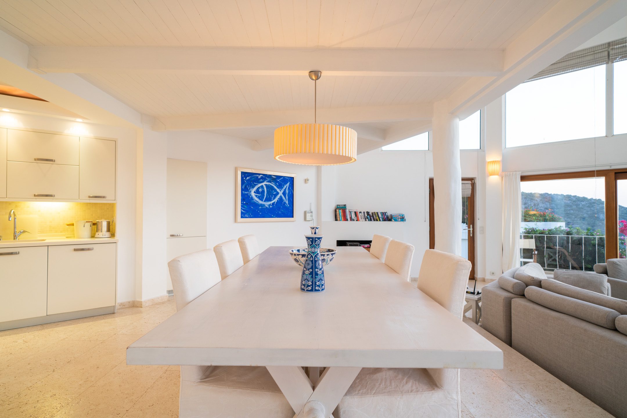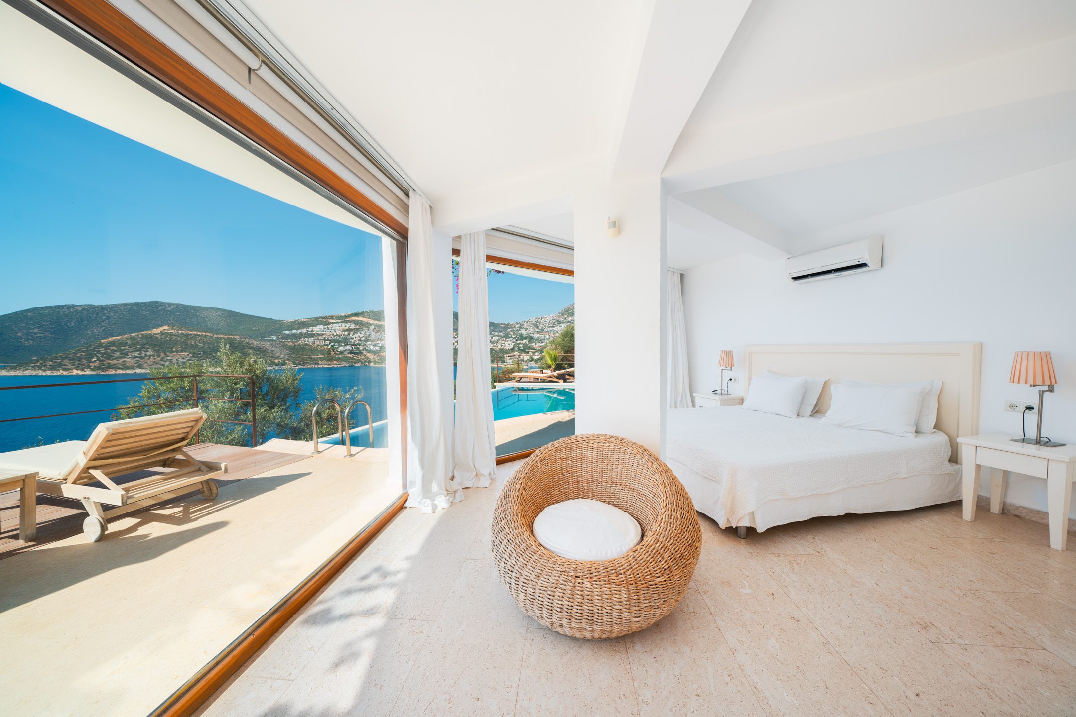 Villa Ruya is a 3-bedroom, all-en-suite, air-conditioned Villa. The property is a collection of 4 Villas each with their own private infinity pool and all located on the pine clad hillside grounds of the prestigious Hotel Villa Mahal in Kalkan – the Hotel was created by designer Ipek Tolbas whose attention to detail is evident everywhere from the elegant sweep of curved white walls through to the elegant modern interiors that enhance the space and compliment the natural light.