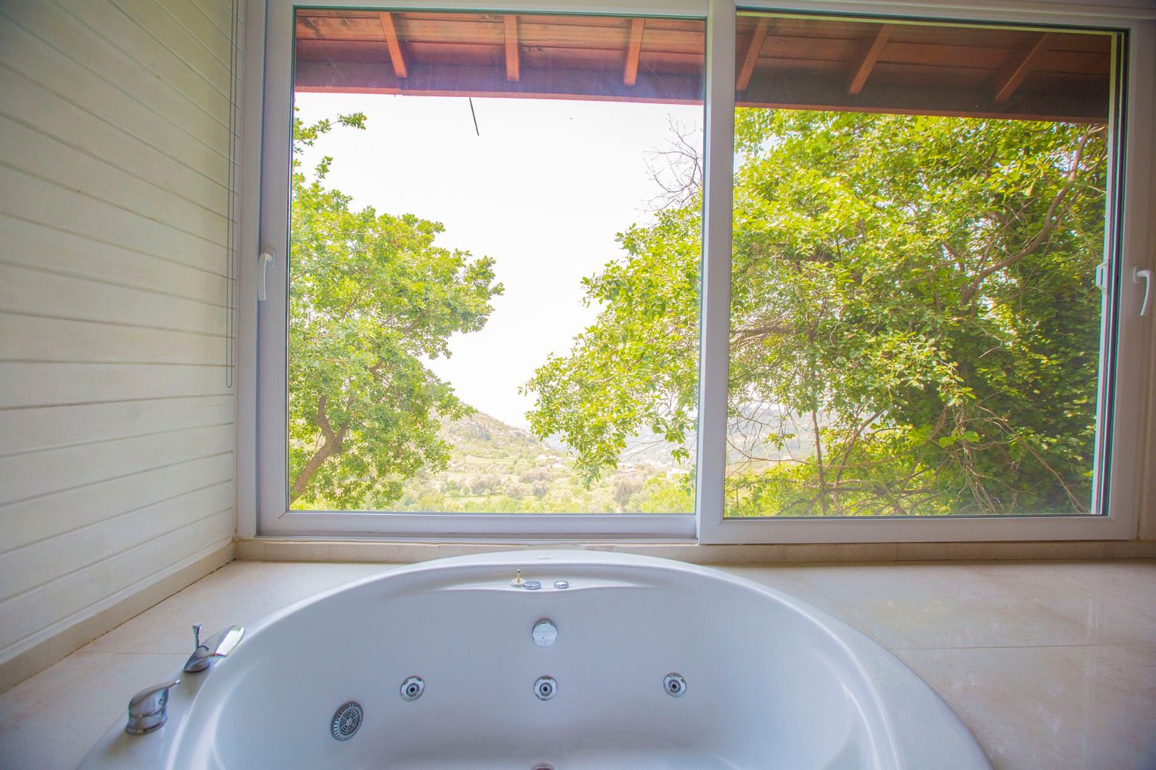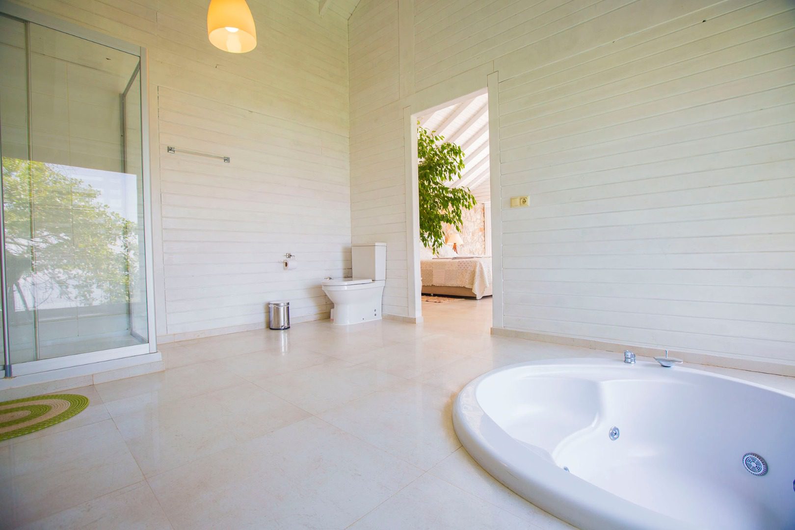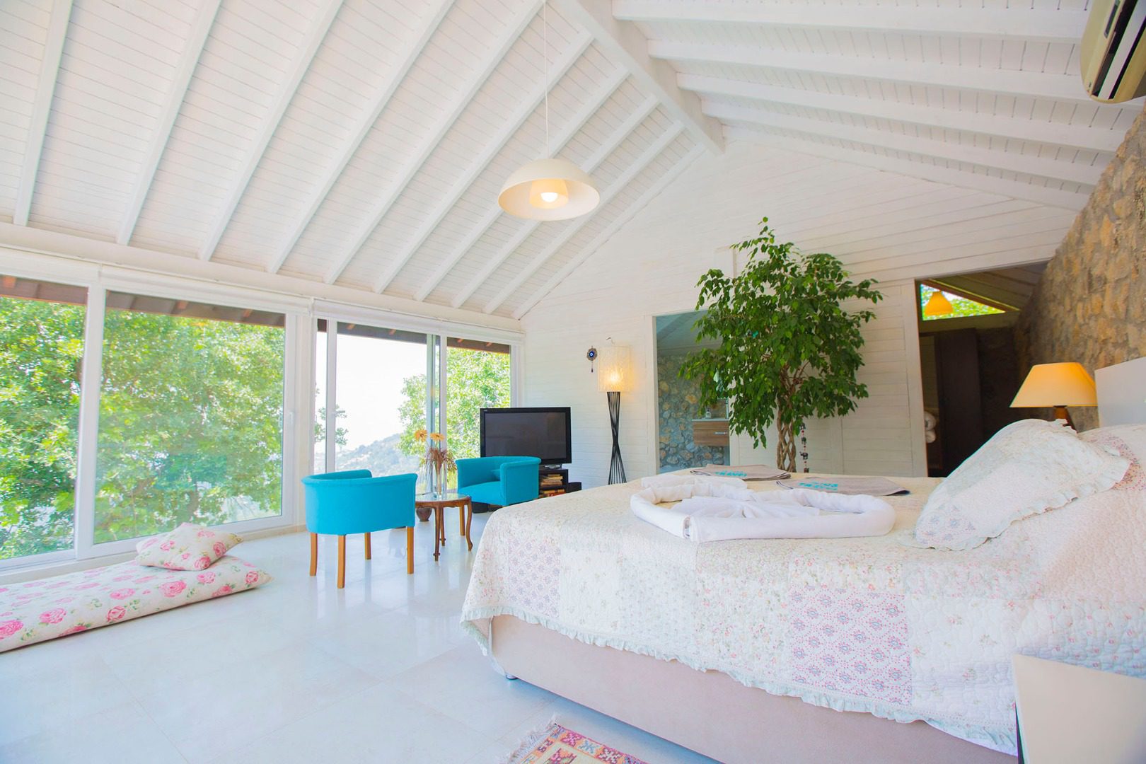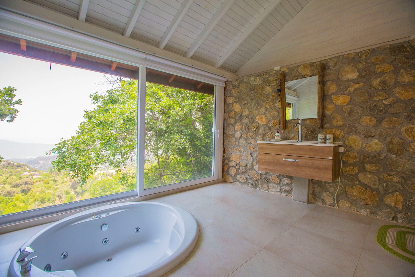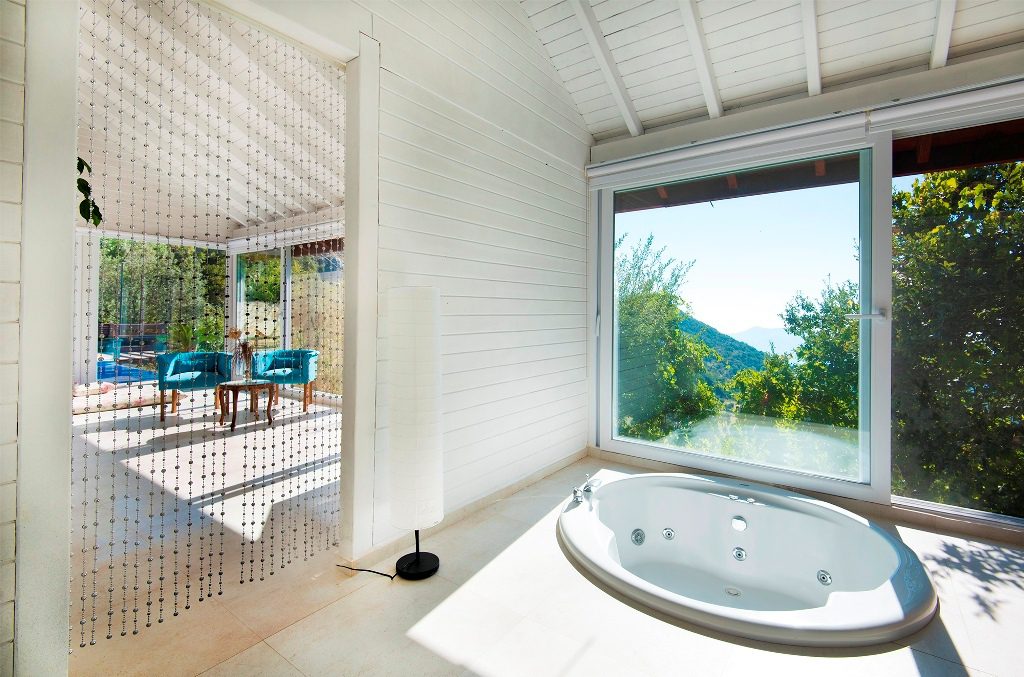 The interior of villa Salkim Evi comprises a spacious bedroom, a separate kitchen and a large separate bathroom. The generously sized bedroom includes a seating area and a flat screen TV and looks out over the greenery of the village. In the en suite bathroom, guests can enjoy the large private jacuzzi and stargaze at night through the full-height windows. The bathroom also features a separate shower cubicle.