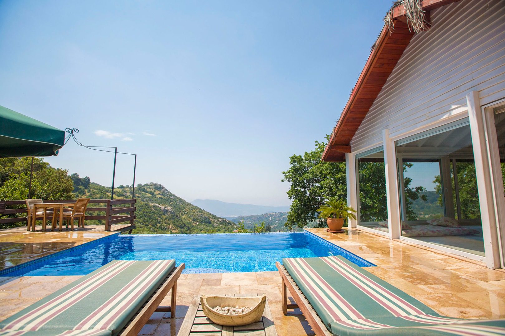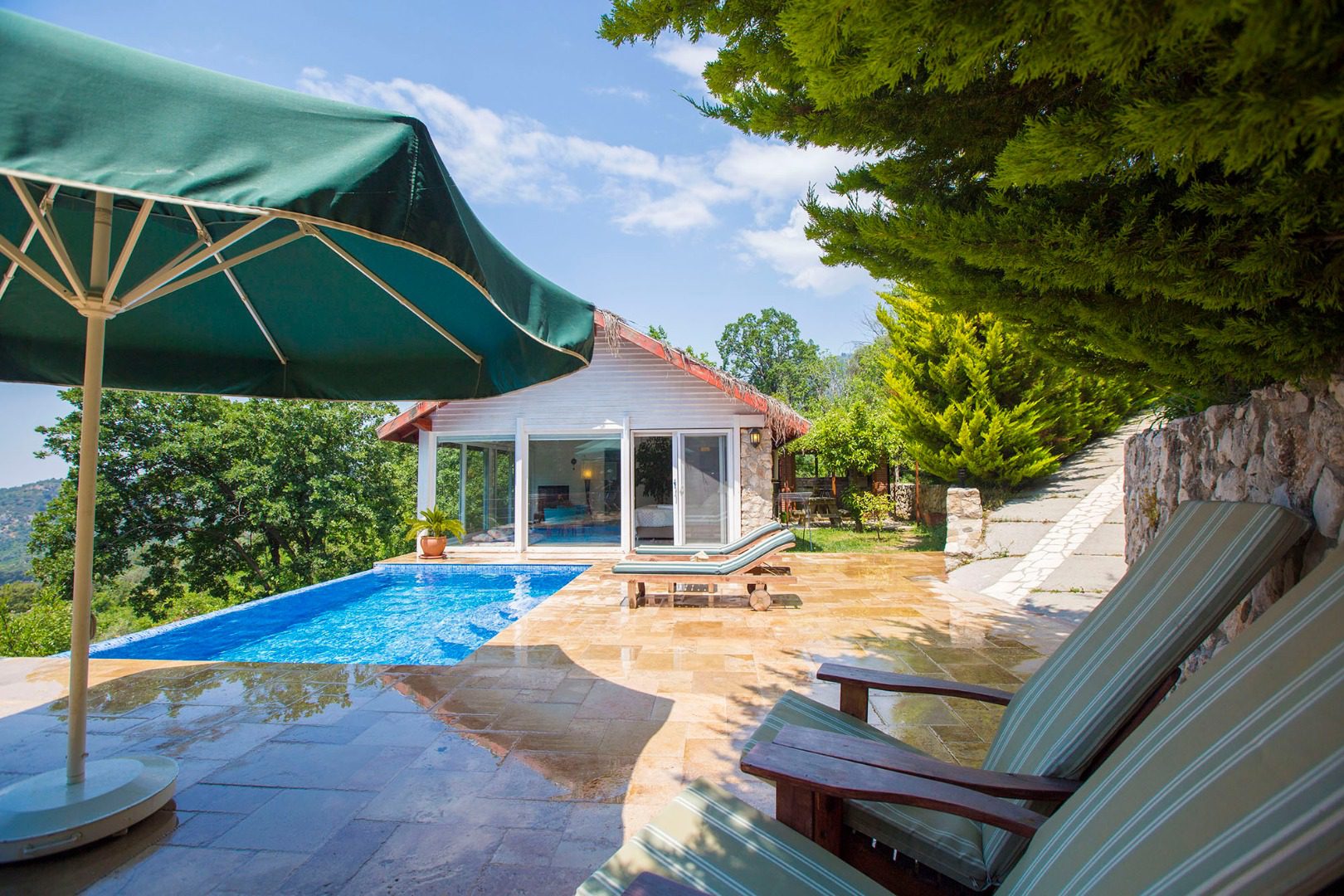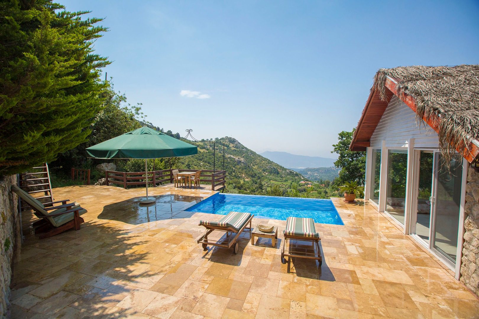 The pool terrace and garden area at Villa Salkim Evi are surrounded by mature trees, with the infinity pool facing out over the cascading green mountains in front of the villa. The spacious terrace features a private swimming pool, sun loungers, a seating area and a parasol. Wrapping around the villa is a shaded green garden area with a kitchenette, space for barbecuing, and an outdoor dining area. Steps from the pool terrace lead up to a shaded raised platform where you can read and enjoy the nature views.