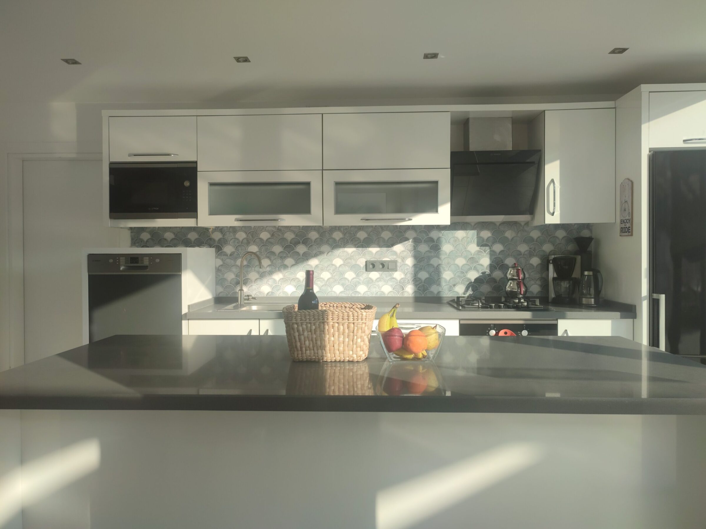 The kitchen has a breakfast bar and oven, hob, extractor, fridge freezer and dishwasher. The glass doors give access to the sun terrace and outside dining area.