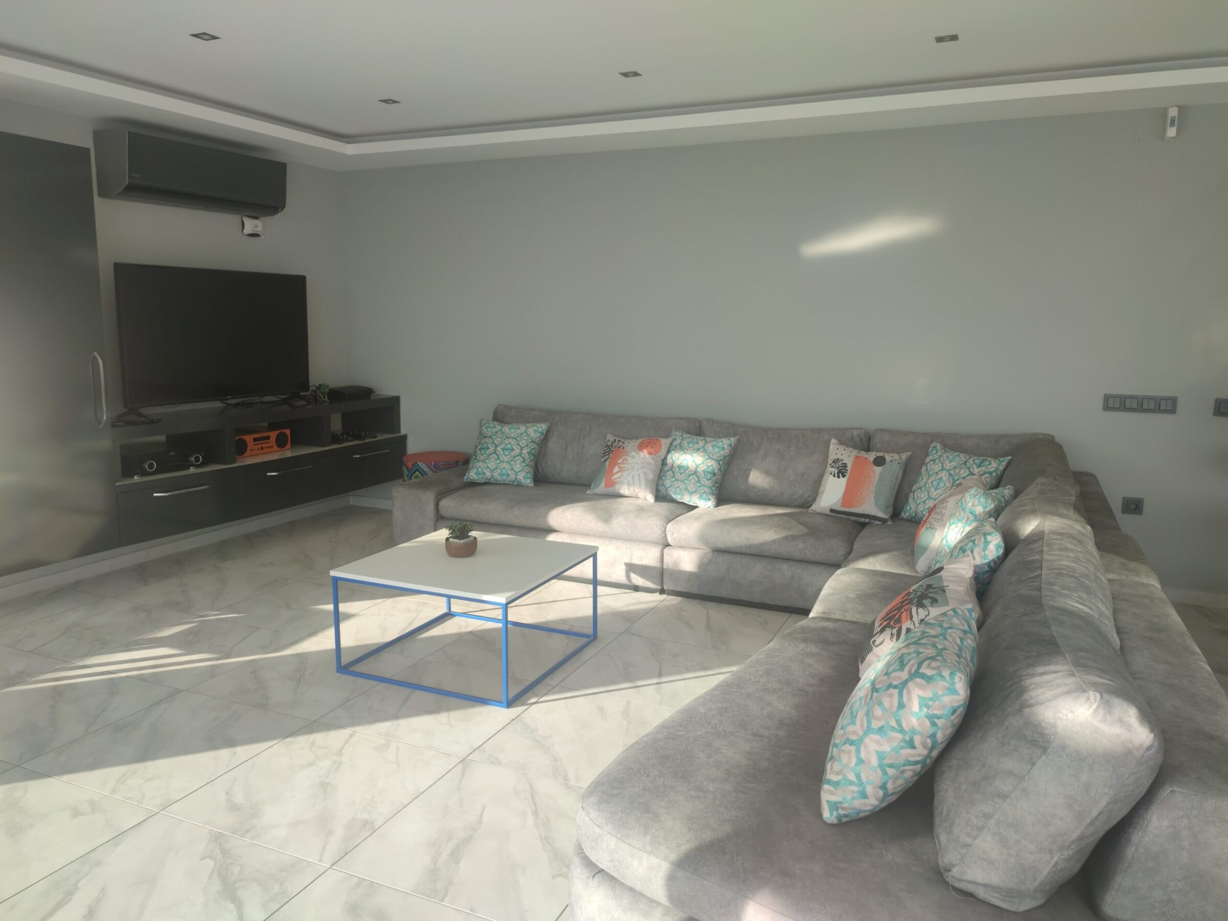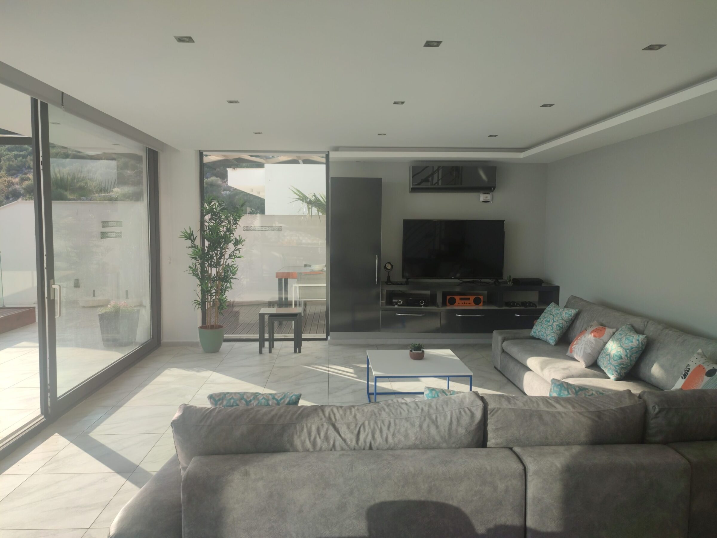 The lounge is elegantly arranged with a large L-shaped sofa, flat-screen TV, audio system, and floor-to-ceiling windows that open onto the terrace, framing the mesmerising views of Kalamar Bay and allowing the soft coastal breeze to circulate throughout the villa.