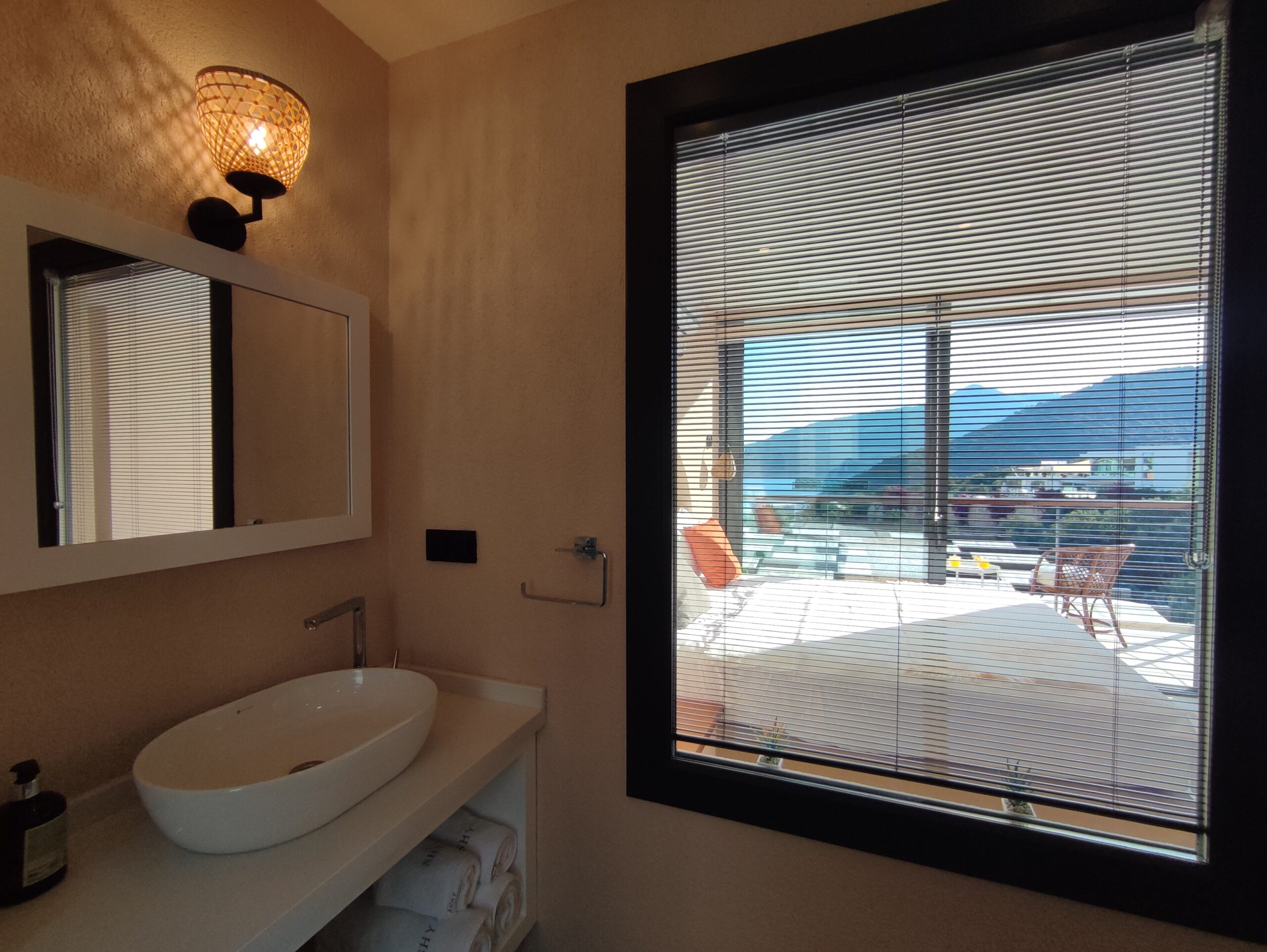 Villa Ship Ahoy’s terrace has been designed for comfort and laid-back luxury. A large private infinity pool (which is an irregular shape but measures approx. 9.5m x 3.5m, 1.7m depth) is the centrepiece. The terrace is thoughtfully furnished with 8 cushioned sun loungers, parasols, and a rattan seating area under a shaded pergola, the ideal place to enjoy a morning coffee or sunset drink.