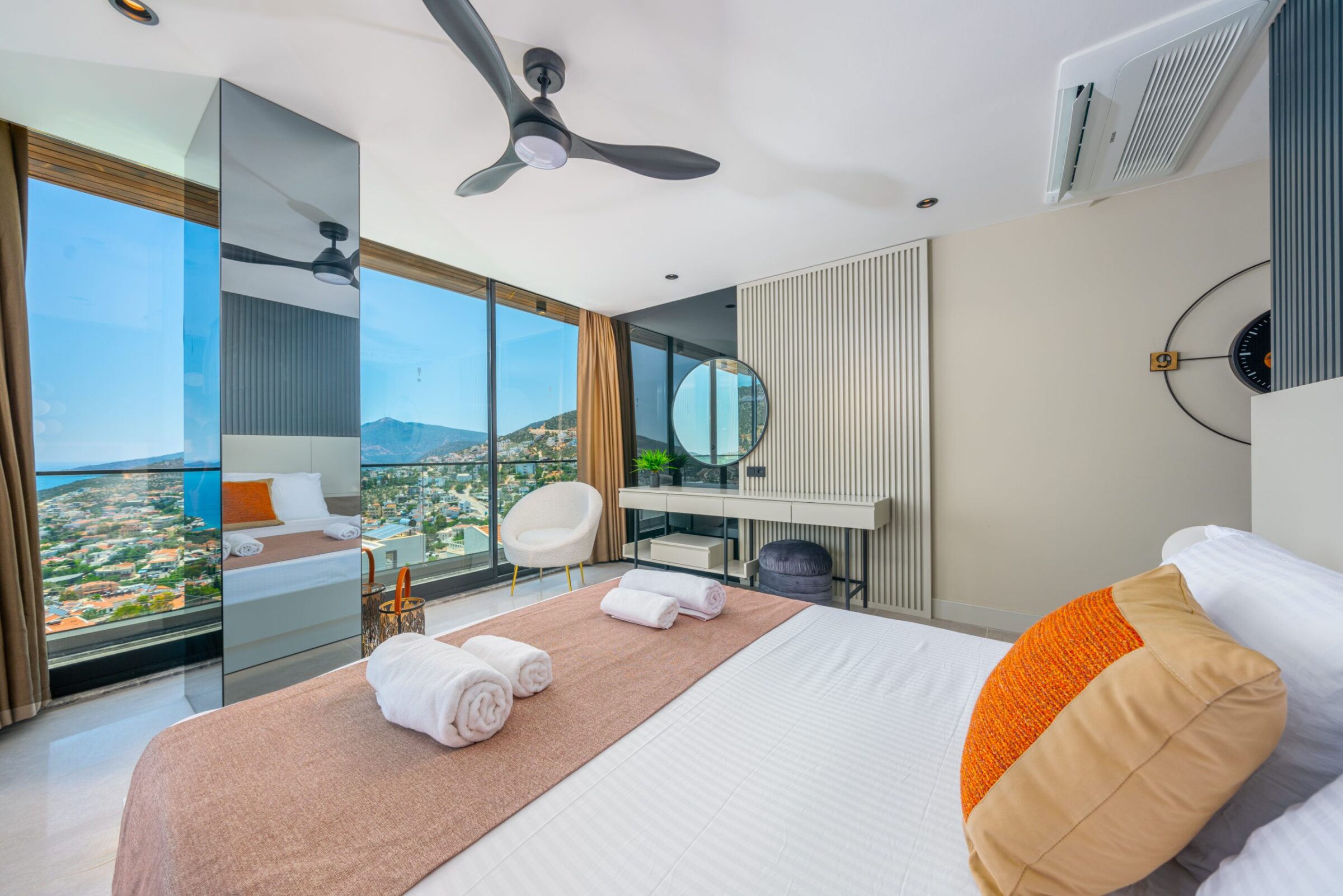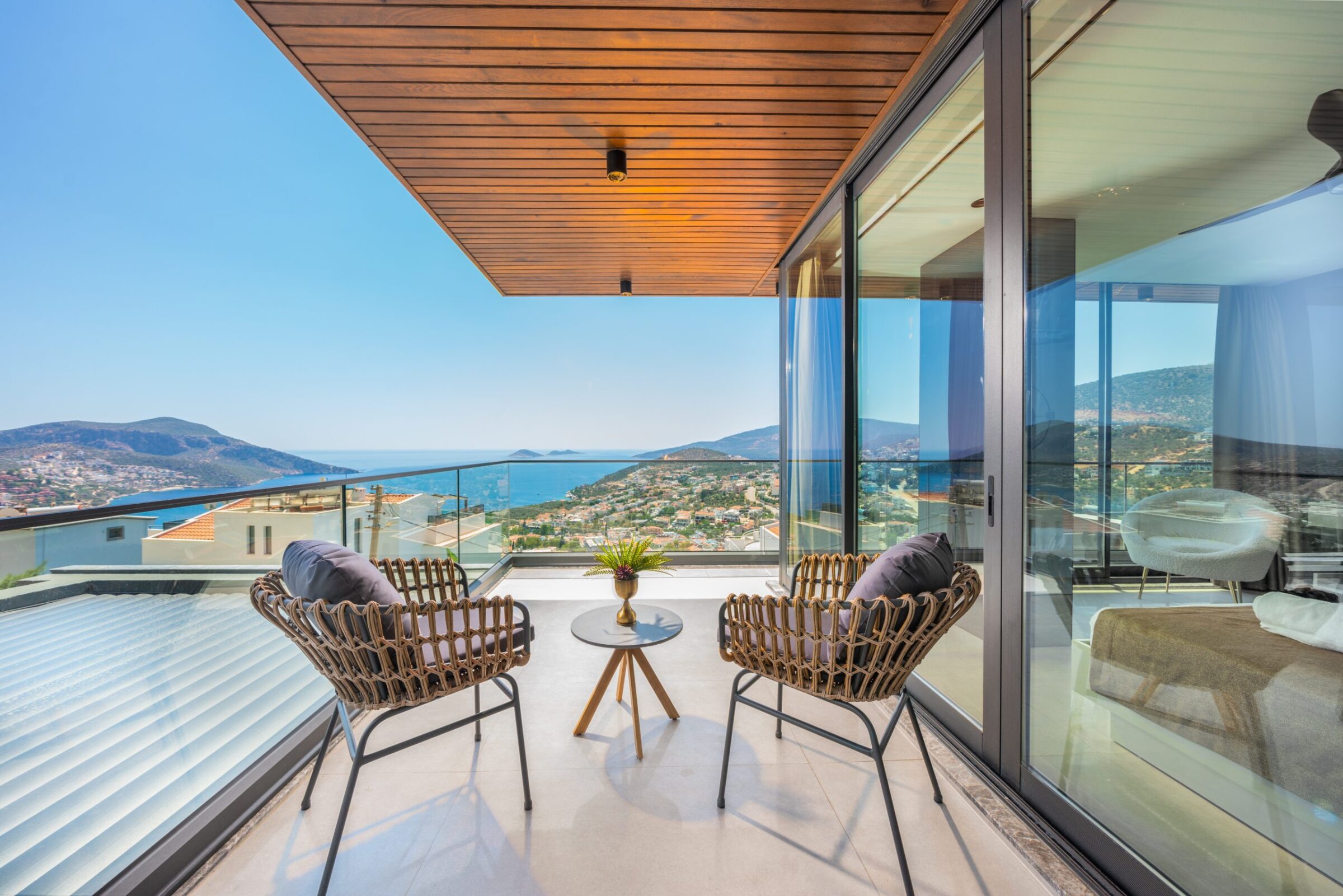 • Two double en-suite bedrooms with floor-to-ceiling windows and private, furnished balconies overlooking Kalkan Bay