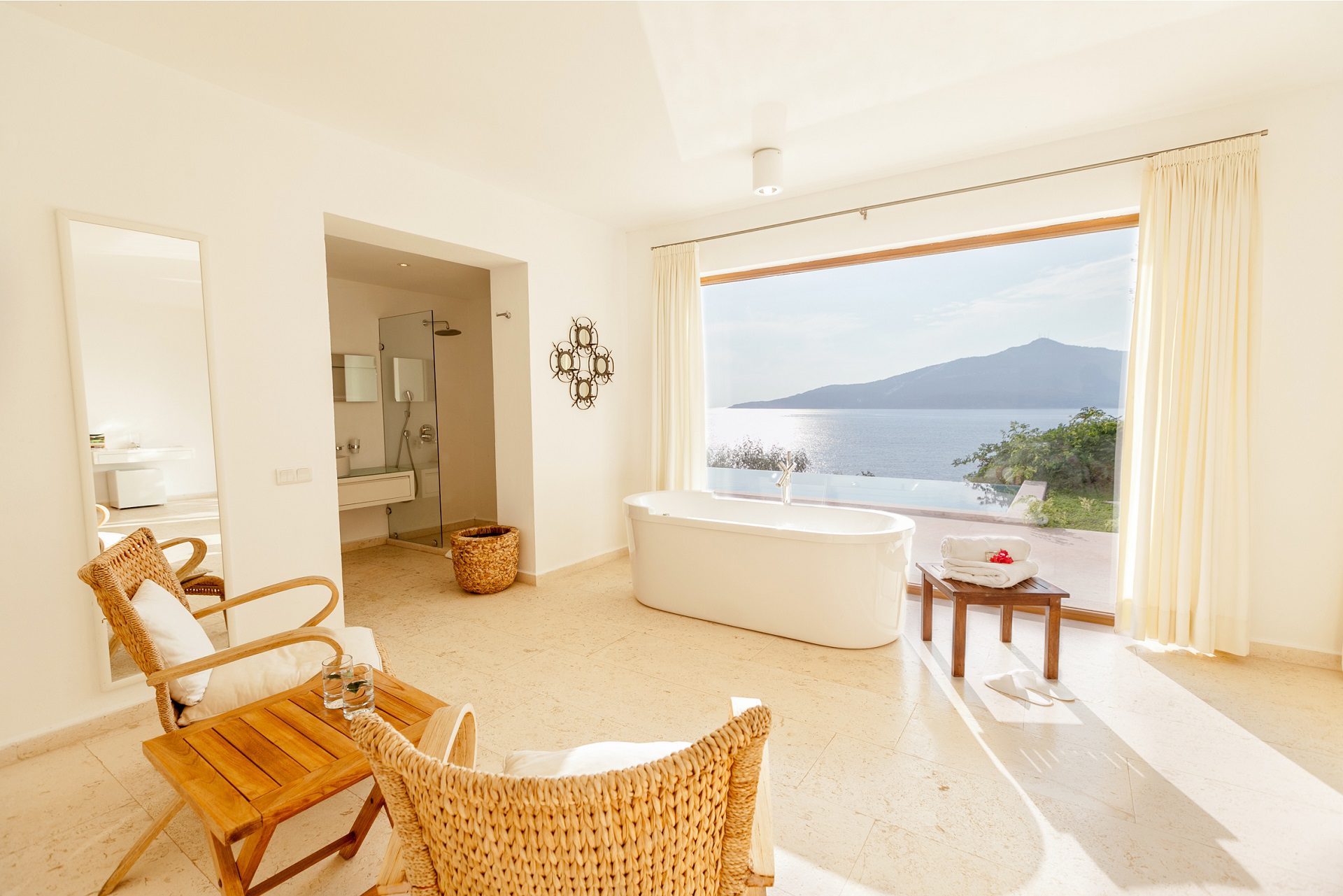 Villa Yang’s private terrace is positioned to maximise its elevated sea views across Kalkan Bay. From sunrise to sunset, the scenery is simply mesmerising. The outdoor space features an infinity-edge pool (8m x 3m), sun loungers, and a seating area where guests can unwind or enjoy al fresco dining while soaking up the sights and sounds of the coast. The private setting ensures calm and seclusion, while the hotel’s beachfront is just a short stroll away.