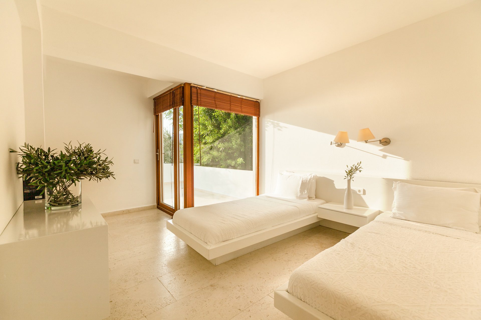 Twin Bedroom (approx 20 sq m) – south west facing with sea and mountain views with a door that opens onto the pool terrace, En suite shower and WC,