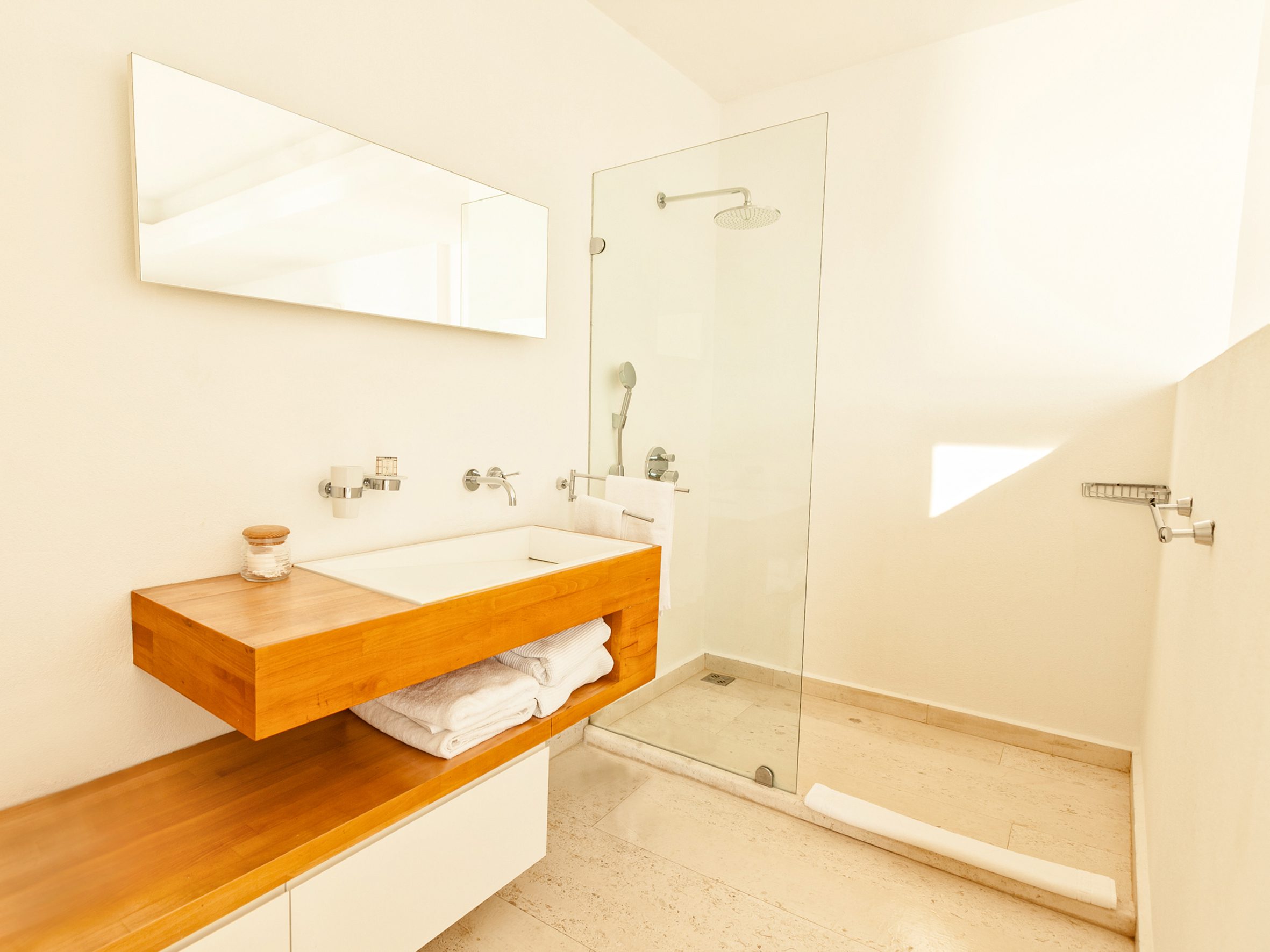 The front door opens onto an extremely large open-plan living room with double height ceiling and a wow factor wall of glass that provides spectacular panoramic views across the Bay. The room is divided into seperate areas: a comfortable sitting area with TV and multimedia system, a dining area with seating for 6 people and a large fully fitted kitchen. Sliding doors open onto a large terrace which is ideal for dining al fresco and enjoying the spectacular views and sunsets.