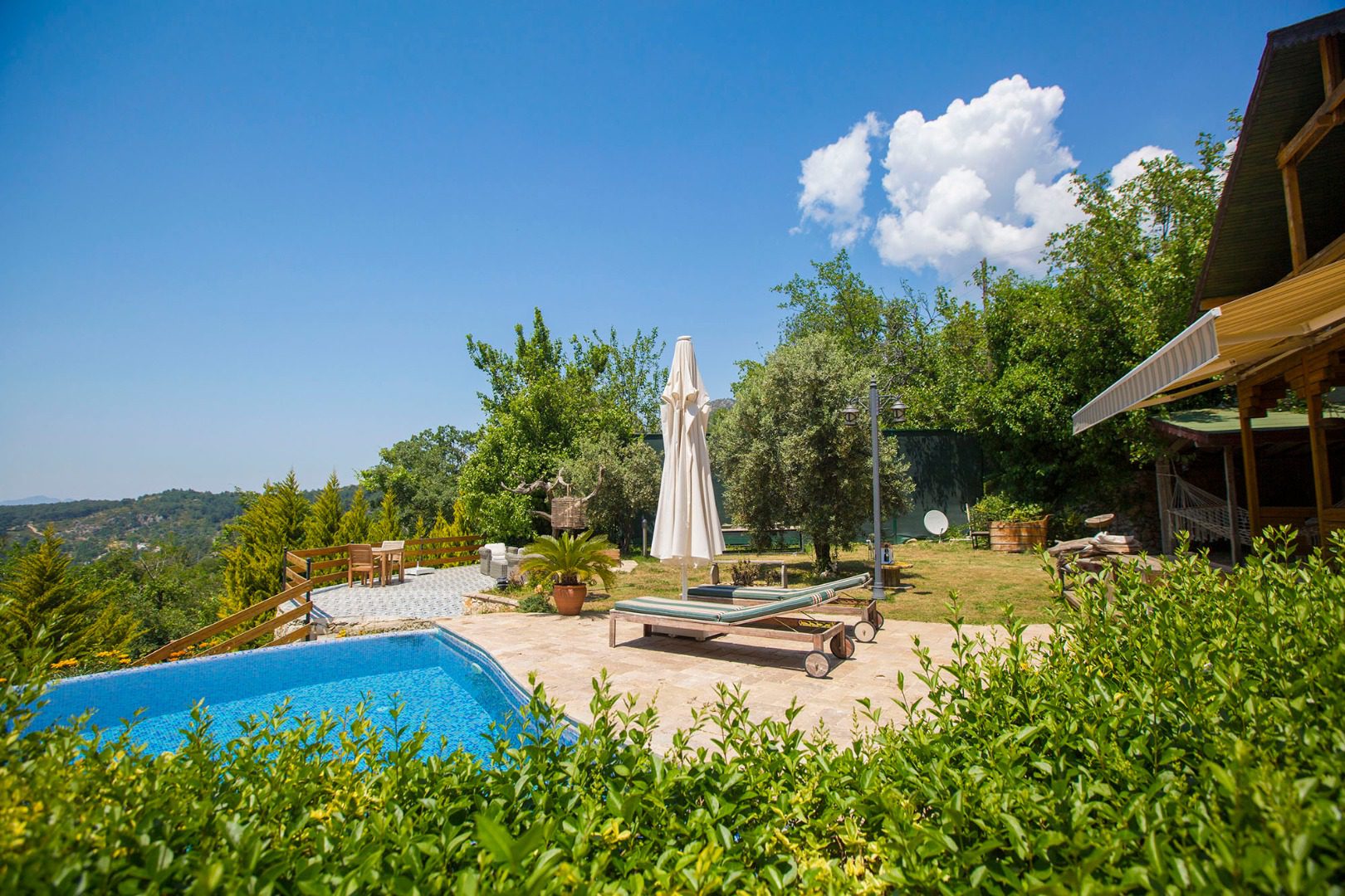 Villa Zeytin Evi has a spacious garden, surrounded by lush greenery, and a private swimming pool create a serene setting—ideal for couples and families who value privacy and tranquillity. Stretching out in front of the villa with beautiful mountain views, this garden space has multiple areas for outdoor lounging and dining, a private infinity swimming pool with roman steps for entry and a hammock, surrounded by lawns with mature olive trees and foliage.